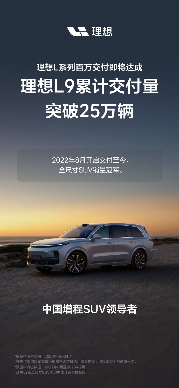 理想 L9 累计交付量突破 25 万辆:2022 年 8 月开启交付至今,全尺寸 SUV 销量冠军。