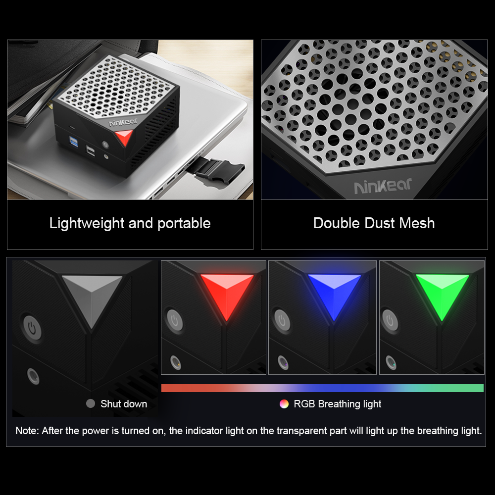 MBOX 8 Pro 长宽均为 99mm,上部厚 37mm、下部厚 25mm、整体厚 65mm,上下两部分由磁吸接口连接。主机顶部为双层防尘网孔,一脚的 RGB 呼吸灯会随开机而启动。