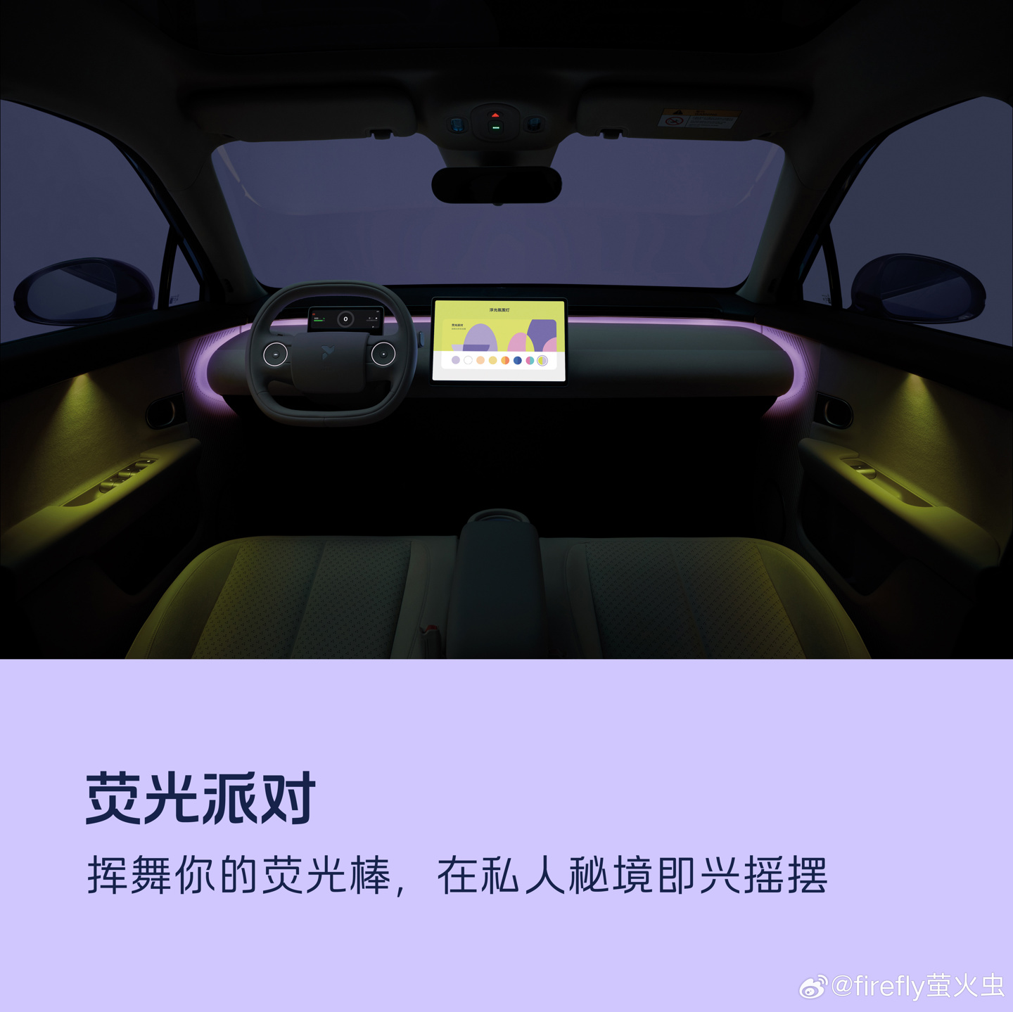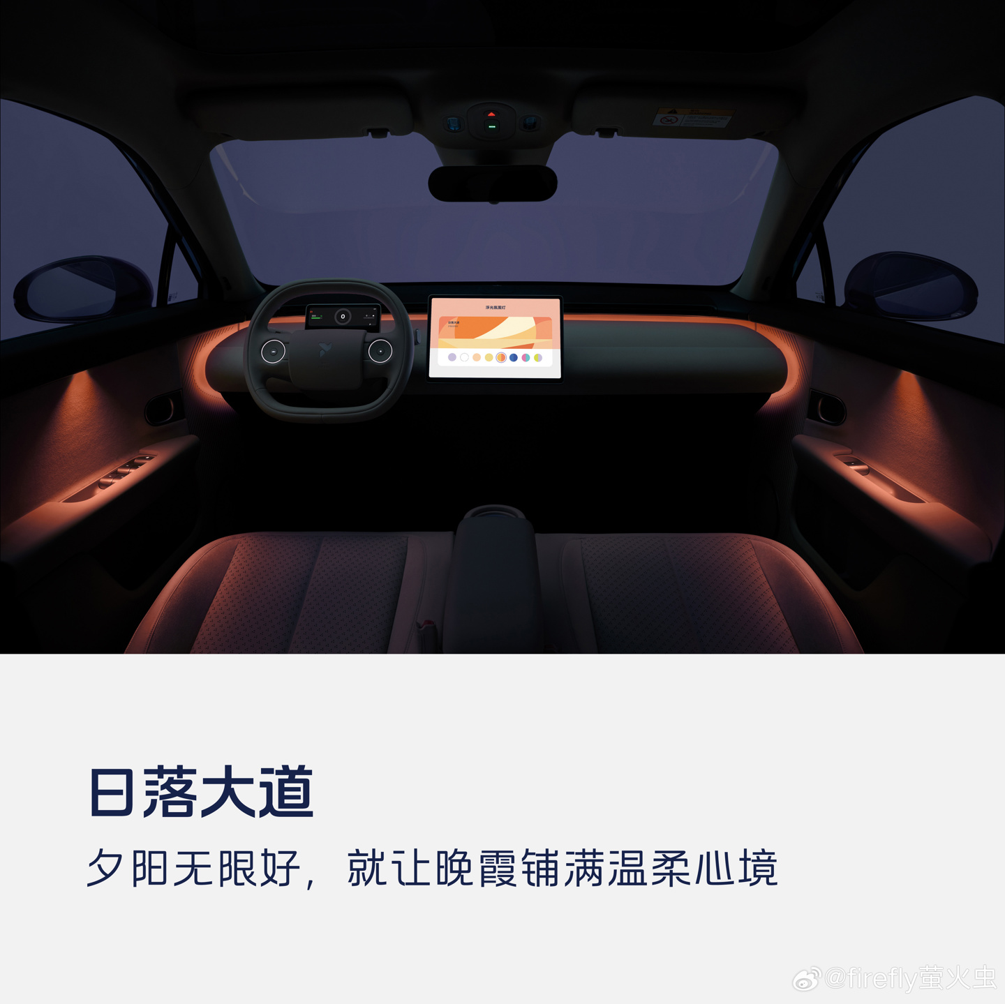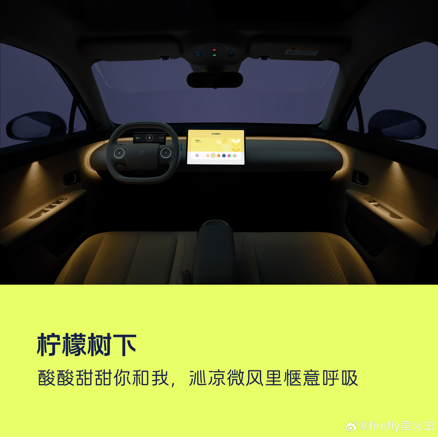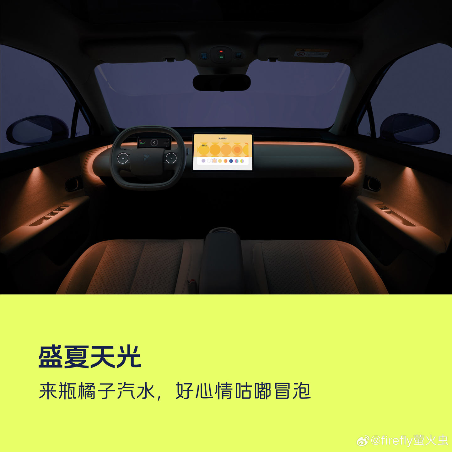 官方此次主要宣传了新车的内饰的氛围灯主题色:柠檬树下(黄色系)、日落大道(橙红色系)、盛夏天光(橙色系)、云间飞行(白色系)、暮色海洋(紫色系)、午夜蓝调(蓝色系)、霓虹舞厅(紫红 + 绿色系)、荧光派对(浅紫色 + 黄色系)。