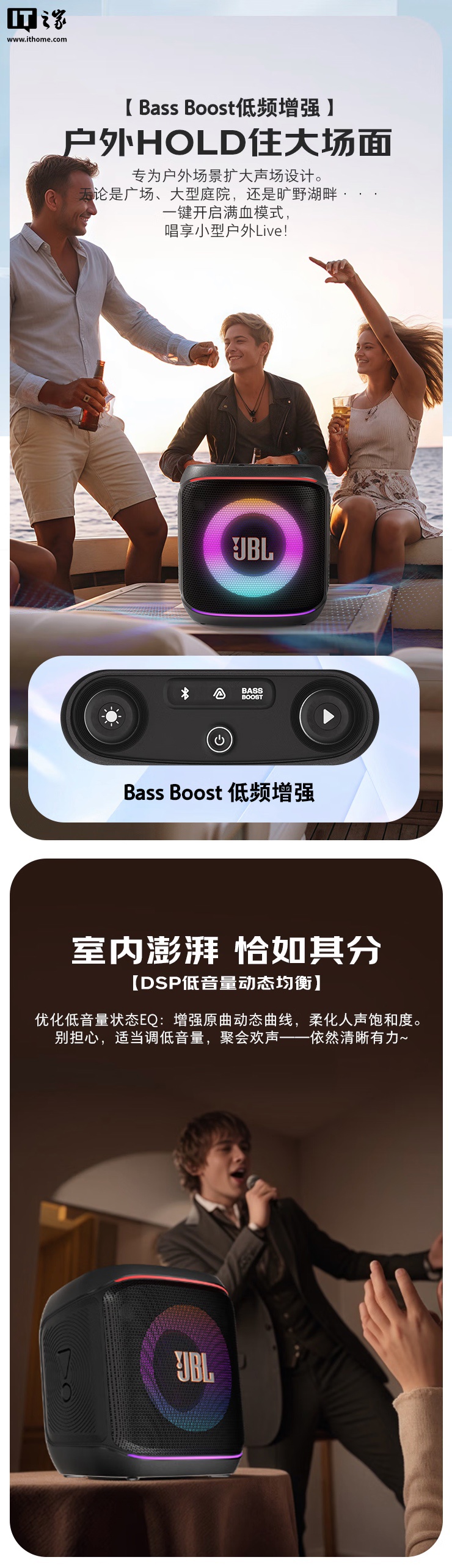 该音箱拥有 100W RMS 峰值功率,支持 Bass Boost 低频增强技术,同时还支持 DSP 低音量动态均衡技术。音箱内置 JBL 派对音效,同时可匹配 JBL 麦克风实现开机自联一键 K 歌功能。