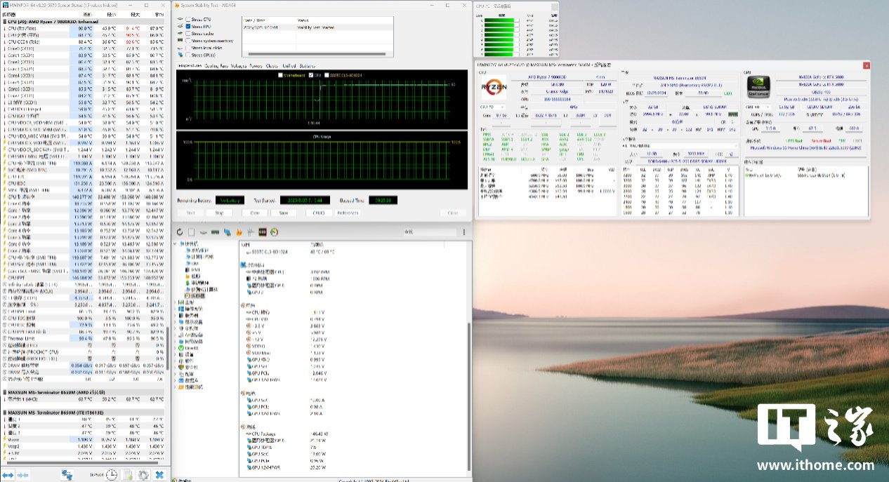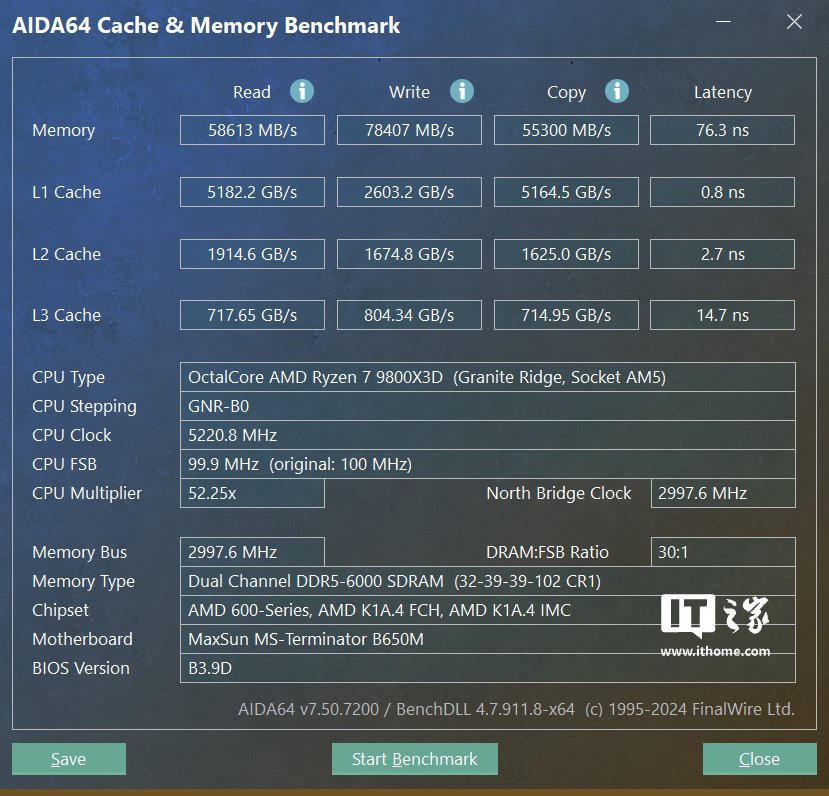 锐龙 7 9800X3D 这颗 CPU 表现相信大家都不陌生了,不过需要注意的是这台主机搭配的主板型号为铭瑄 MS-Terminator B650M,IT之家也没有特意在 BIOS 中进行 PBO 超频的手动微调,只开启了自动 PBO 和解锁 105W 功耗选项,尽可能反映普通用户的真实使用场景。