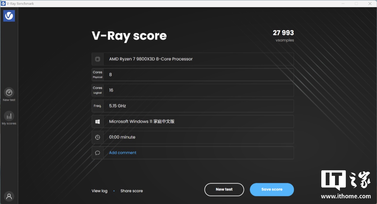 然后是 V-Ray BenchMark 6.0 基准测试,CPU 项目中锐龙 7 9800X3D 得分 27993 分,GPU 项目中 CUDA 得分 5273 分,RTX 得分 8269 分,能够满足专业渲染需求。