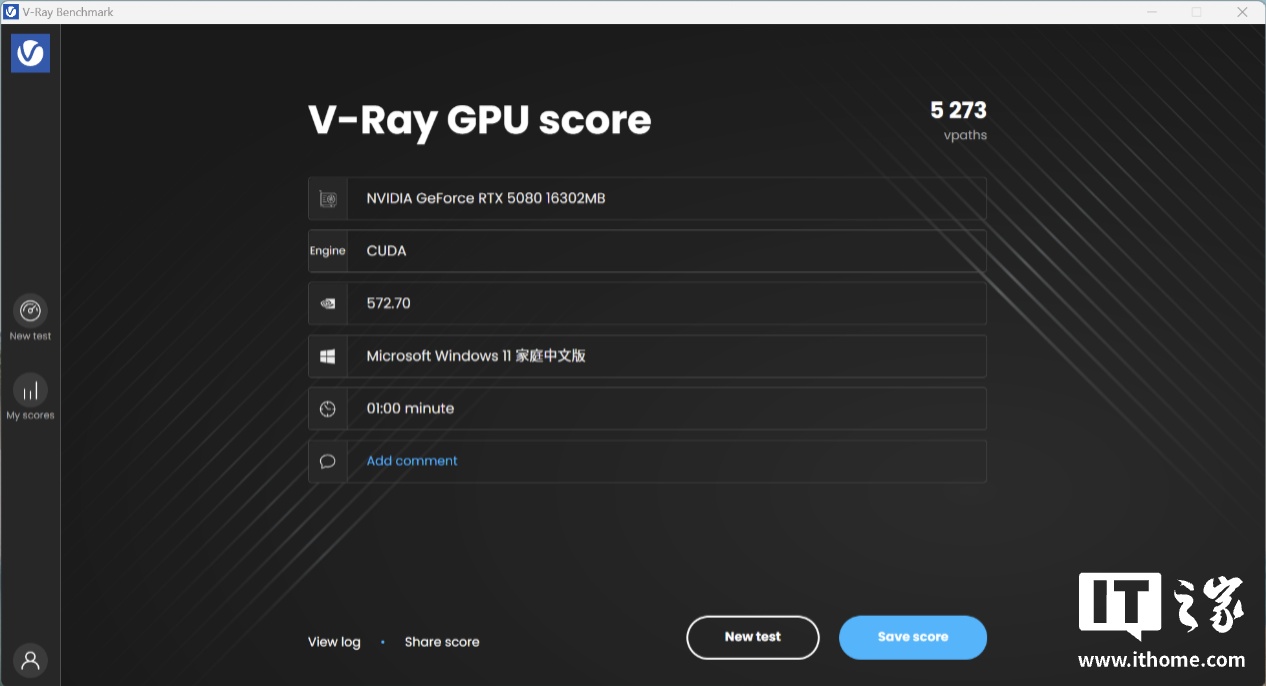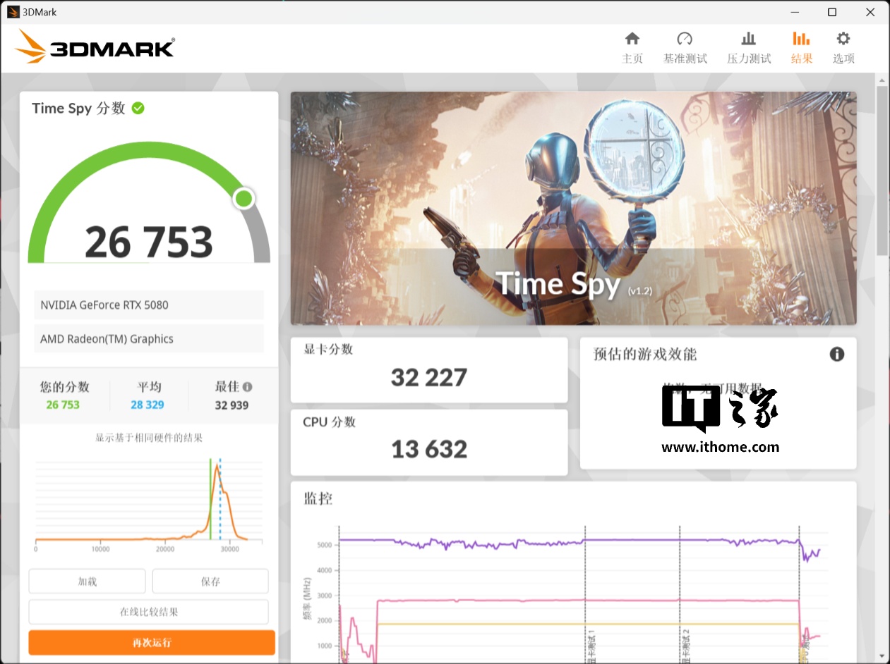 显卡方面,同样采用 3D Mark 进行跑分。在 Time Spy 的测试中,RTX 5080 拿到了 32227 分的显卡分数。作为对比 GeForce RTX 4080 SUPER 公版显卡的分数为 29220 分,性能提升幅度约 10.2%。