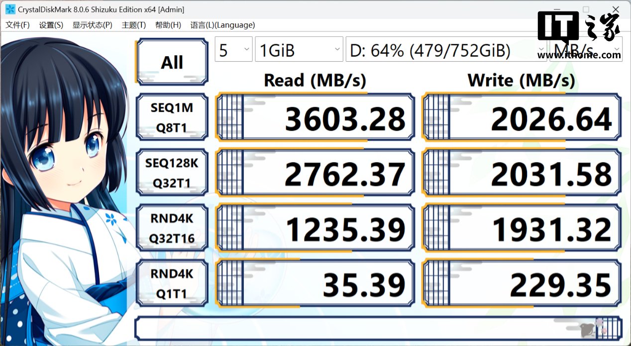 固态硬盘给到了 1TB 容量,速度表现一般。从 CDM 的跑分上看,752GB 分区 + 64% 填盘这种接近日常使用的场景下顺序读取速度为 3600MB/s 左右,顺序写入速度为 2000MB/s 左右。