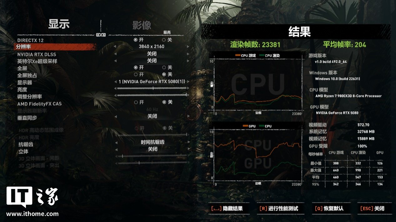 接下来看看两款光栅游戏的表现,第一款《古墓丽影:暗影》以 1080P 分辨率 + 最高画质,运行游戏自带基准测试,游戏平均帧数 358 帧,1% Low 帧 281 帧。