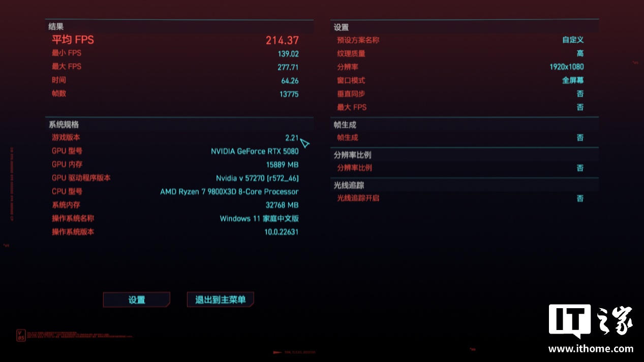 在 1080P 分辨率 + 超级画质下,运行游戏自带基准测试,游戏平均帧数 214 帧;