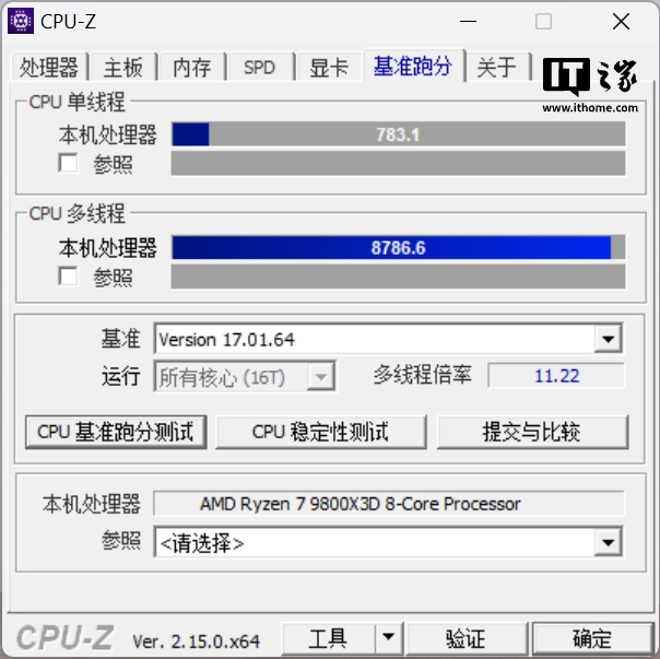 在 CPU-Z 的跑分上,锐龙 7 9800X3D 跑出了单核 783 分,多核 8766 分的成绩,单核成绩相比IT之家历史评测中的 B850 主板最好成绩相差 30 多分,但多核成绩比较亮眼,有 100 多分的领先。