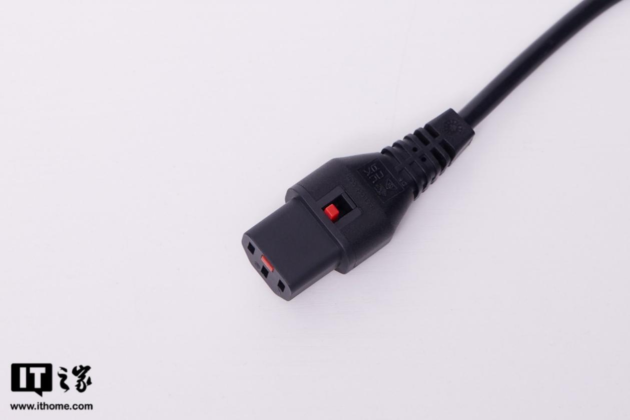顺带一提,雷神黑武士 Shark 游戏主机的电源线自带安全锁扣,拔掉电源线的操作需要先按住红色扣栓后才能顺利拔下,减少了机器突然断电的风险。