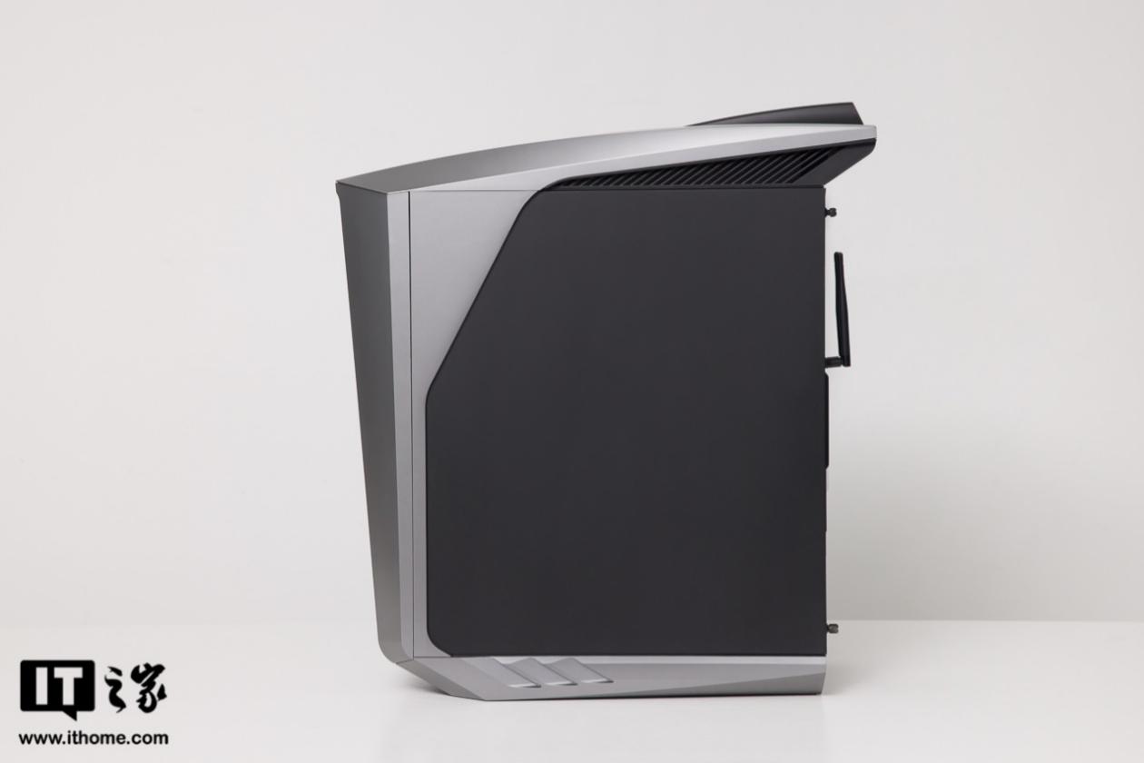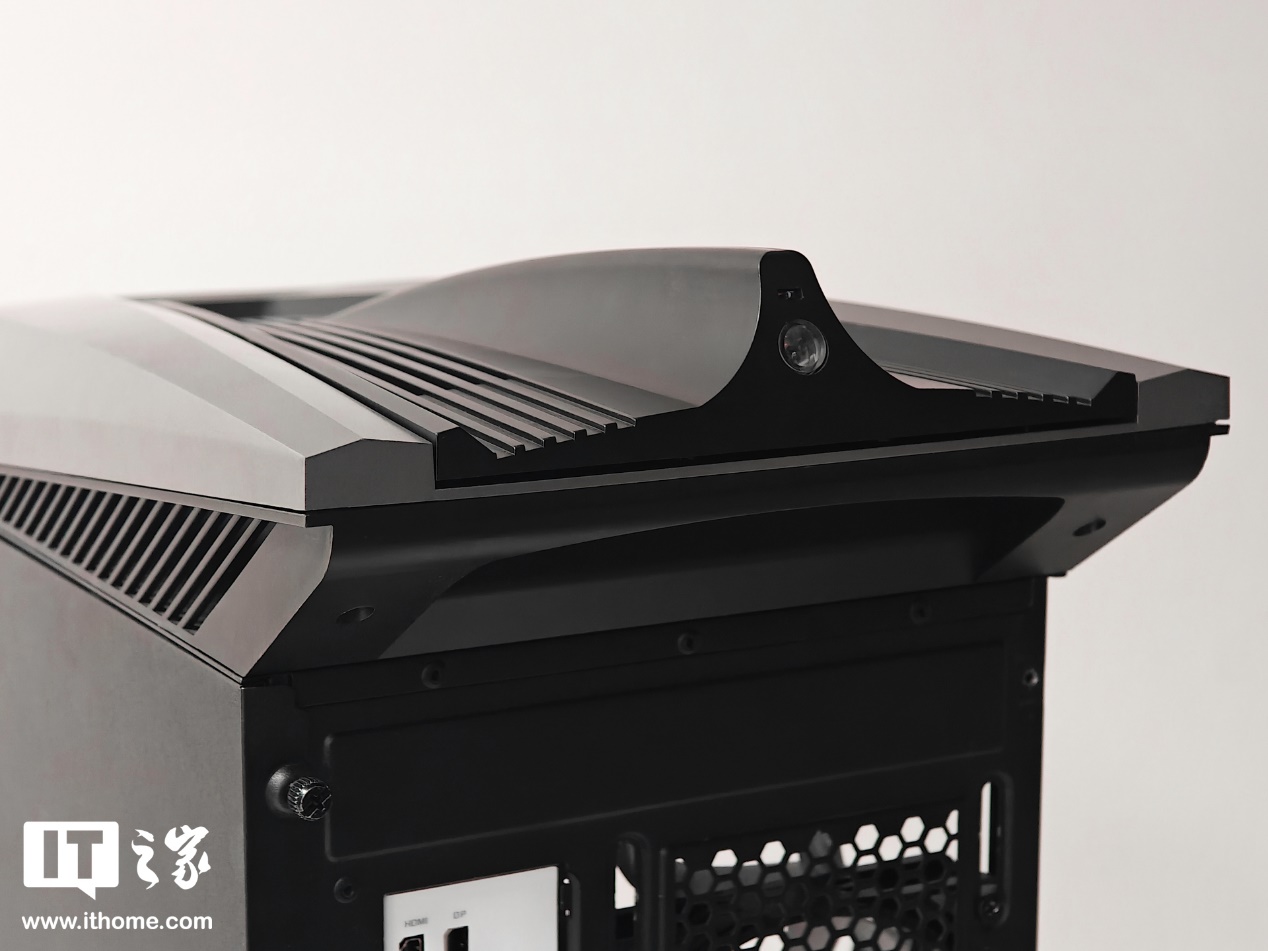 鲨鱼鳍前端则做了两个大角度切边设计,突出流线型和速度感。前端居中位置是一个会发光的电源按键,造型自然是雷神 Logo。黑色的鲨鱼鳍尖可单独拆卸,两侧做了多道出风格栅。