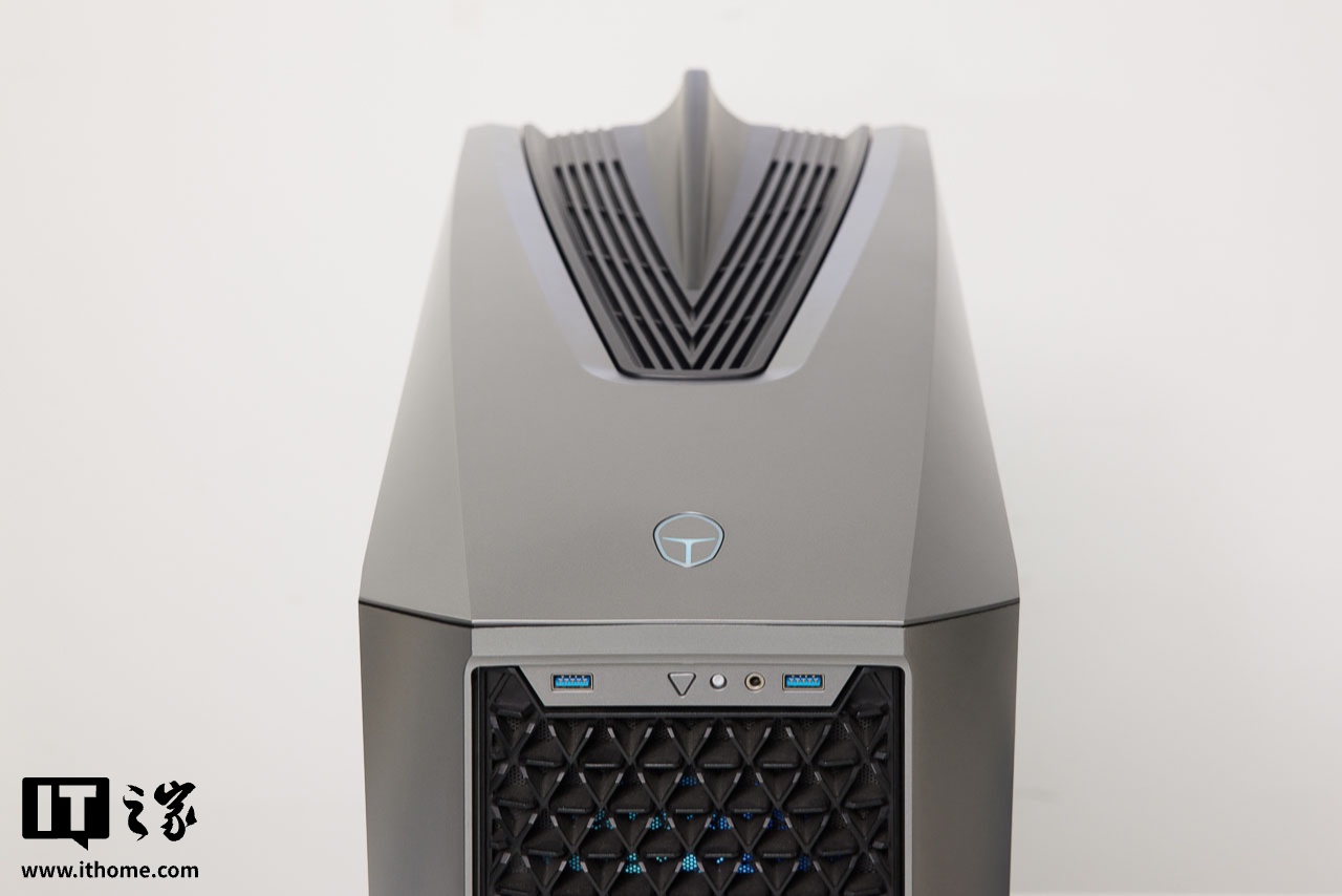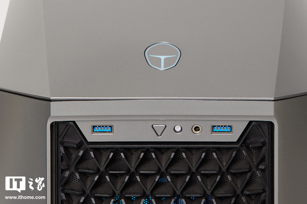 前面板顶部的接口区域设计为倒梯形,提供 2 个 USB3.0 A 口,一个三角形灯光同步按钮、1 个 3.5mm 音频接口,方便用户外接耳机和硬盘等设备。