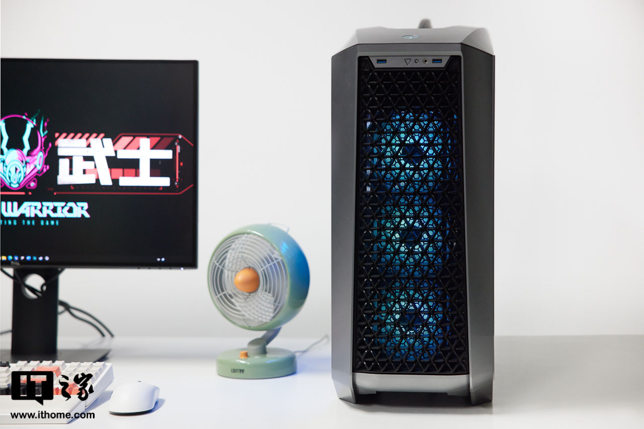 而机箱前面板也设计了大面积的黑色三角网格,开机时便会透过镂空部分展现出机箱内部前侧三风扇的 RGB 灯效,很有感觉。