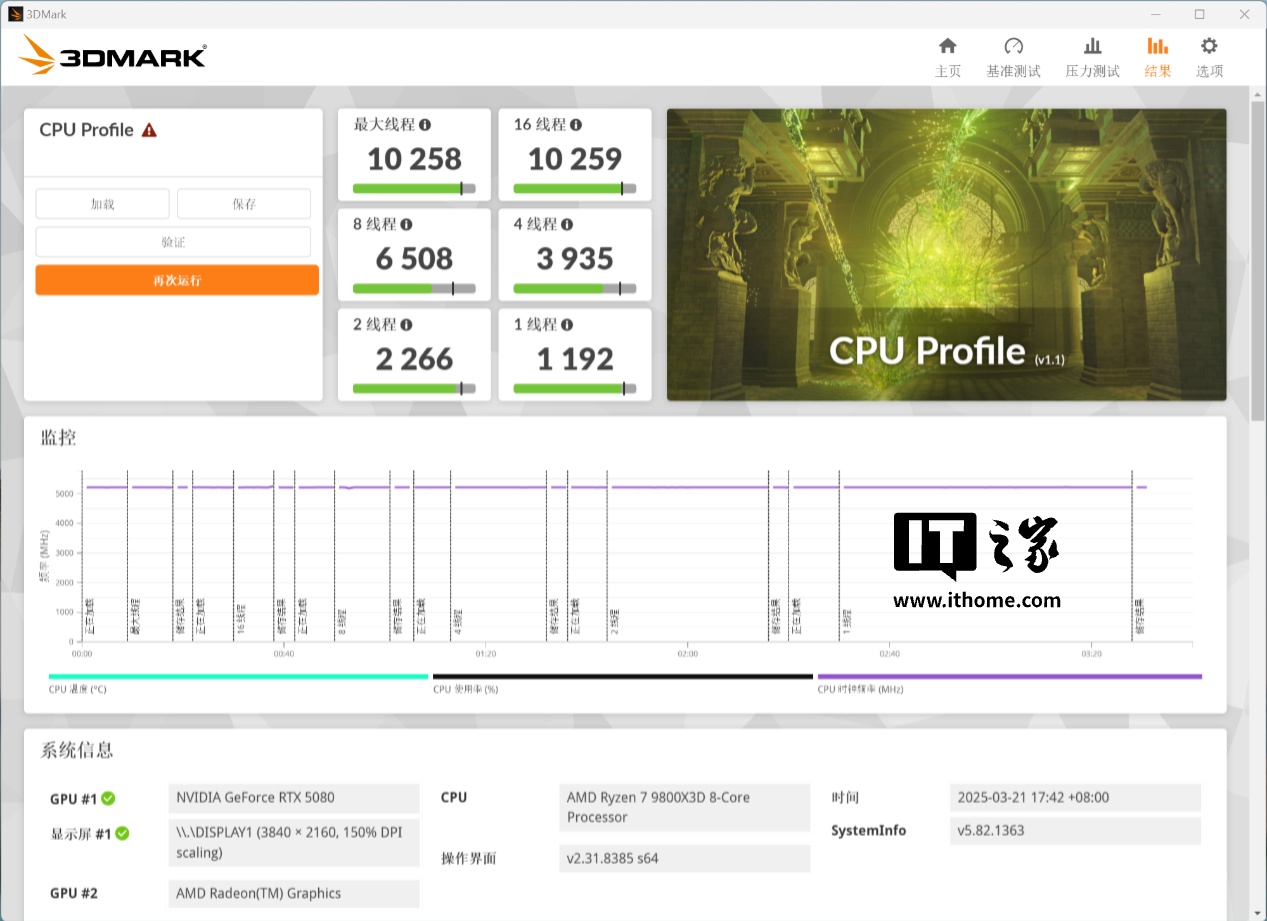然后是 3D Mark CPU Profile 项目的表现,锐龙 7 9800X3D 的单线程得分为 1192 分,最大线程得分为 10258 分,同样持平 B850 主板成绩。