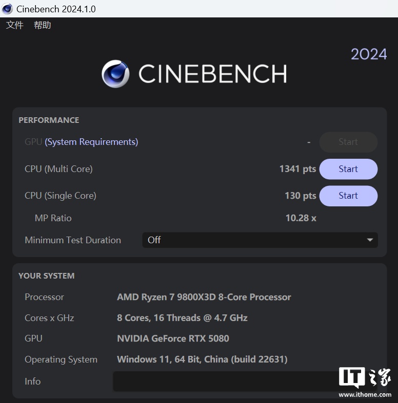 而在 CineBench R24 中,锐龙 7 9800X3D 的 CPU 单核成绩为 130 分,多核成绩为 1341 分,单核分数和 B850 主板成绩持平,多核分数甚至更高一点,完全称得上满血发挥。