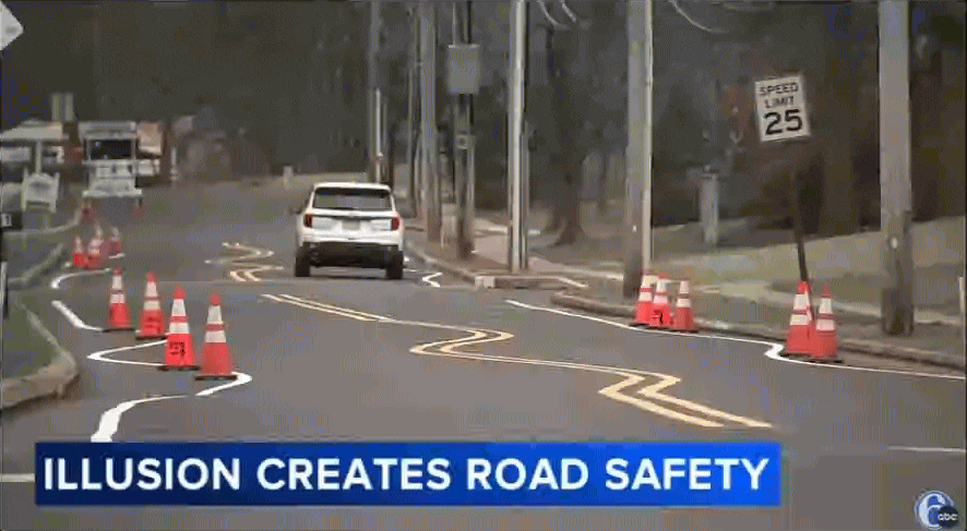 然而,在众多的治理措施中,宾夕法尼亚州蒙哥马利镇的做法无疑非常奇特。这个人口约 2.5 万的小镇决定在其一条名为格雷斯巷(Grays Lane)的道路上涂画上弯弯曲曲的线条,最终的效果使得这条道路看起来像一幅略显荒诞的超现实主义画作。