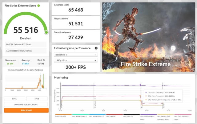 随后,该玩家将这颗 CPU 装在他的电脑上(IT之家备注:配置为微星 MEG X870E 超神主板、RTX 5090 显卡和定制水冷系统),并开始进行超频测试,最后经过多轮测试,这颗 CPU 最高超频到了 5942.9MHz,满载温度稳定在 72-73 度,在 3D Mark 的 Fire Strike Extreme 跑分中得分 55516 分。