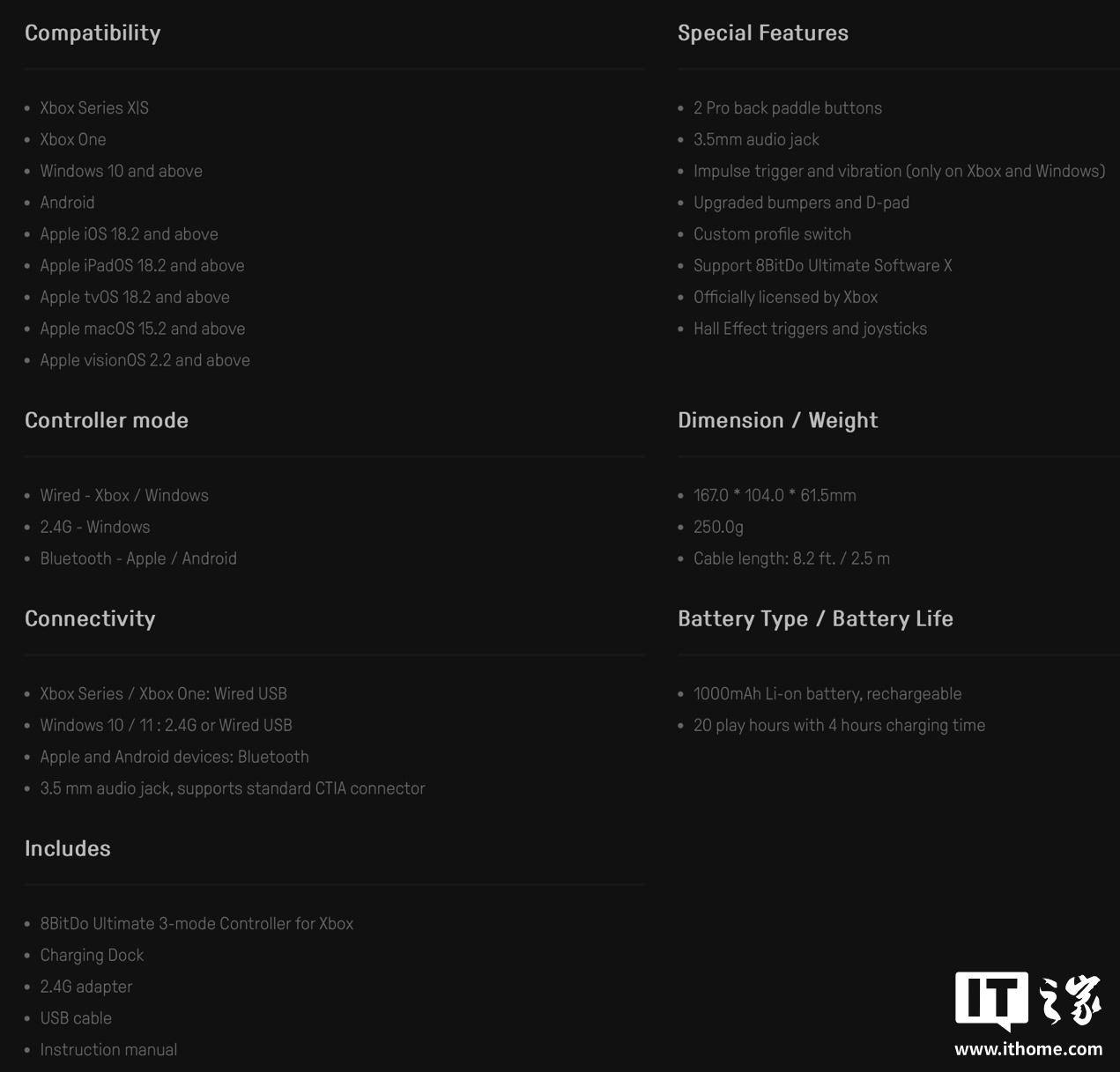 同时,该手柄由于有 Xbox 官方授权,所以具有 Xbox“西瓜”键、截图键和菜单键等 Xbox 手柄标志性按键;该手柄具有 PC、Xbox 和手机三种模式,同时支持蓝牙、USB 和 2.4G 三种连接方式,在连接 Xbox 时还可以使用位于手柄底部的 3.5mm 耳机孔。