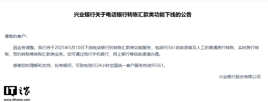 IT之家 4 月 1 日消息,兴业银行股份有限公司今日发布公告,宣布将下线电话银行转账汇款类功能。IT之家附原文如下: