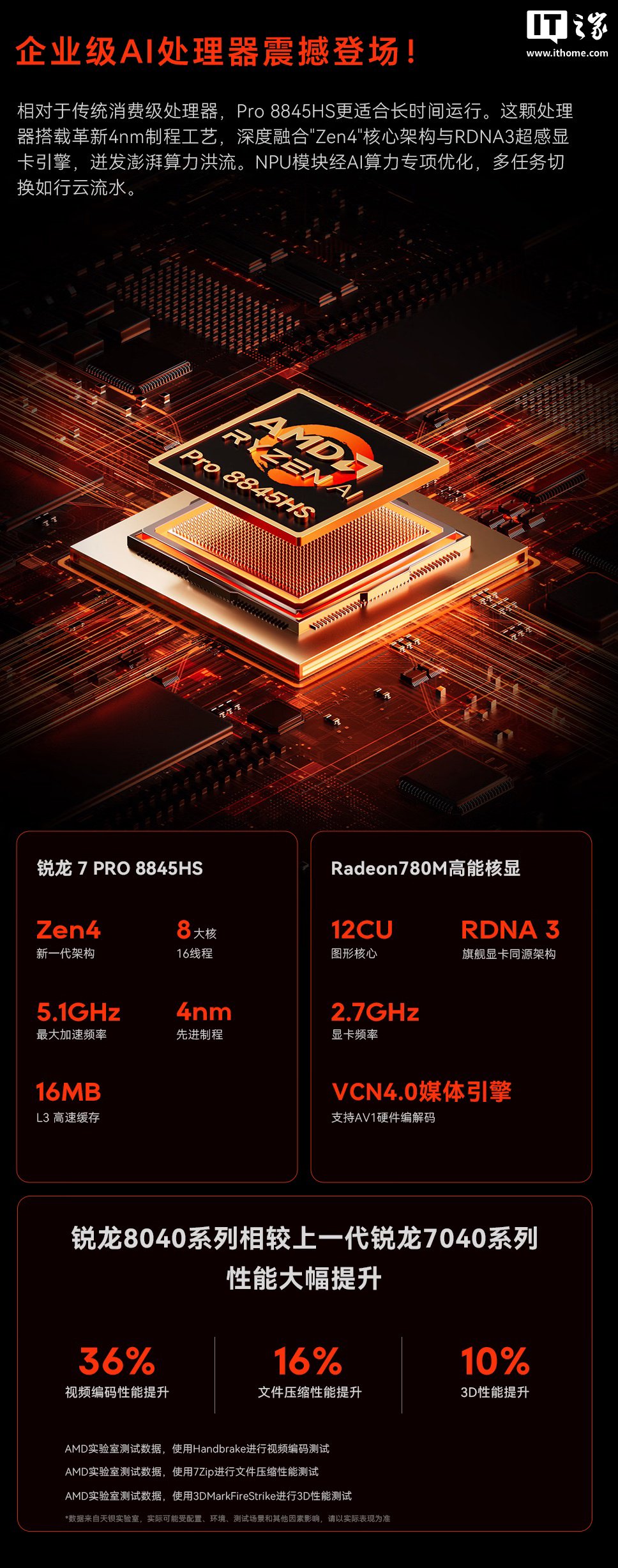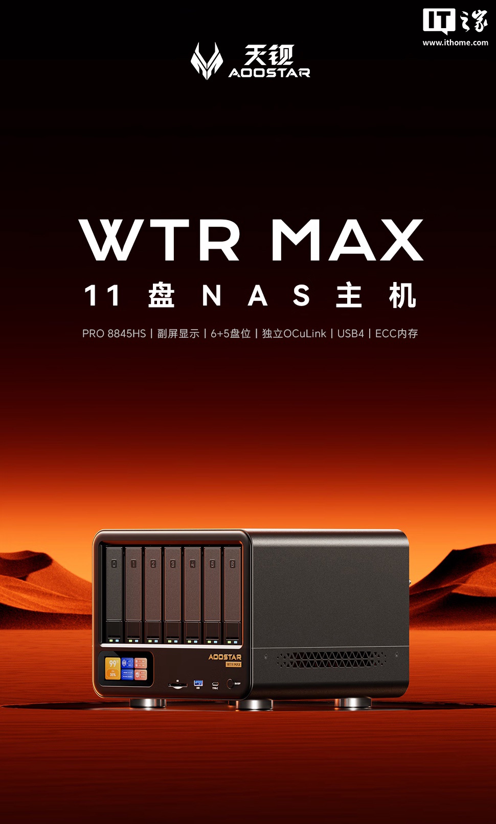 IT之家从官方获悉,该机搭载 8 核 16 线程 AMD R7 Pro 8845HS 商用处理器,配备 DDR5 ECC RAM 内存,提供了 6 个 3.5 英寸硬盘位 + 5 个 M.2 插槽。