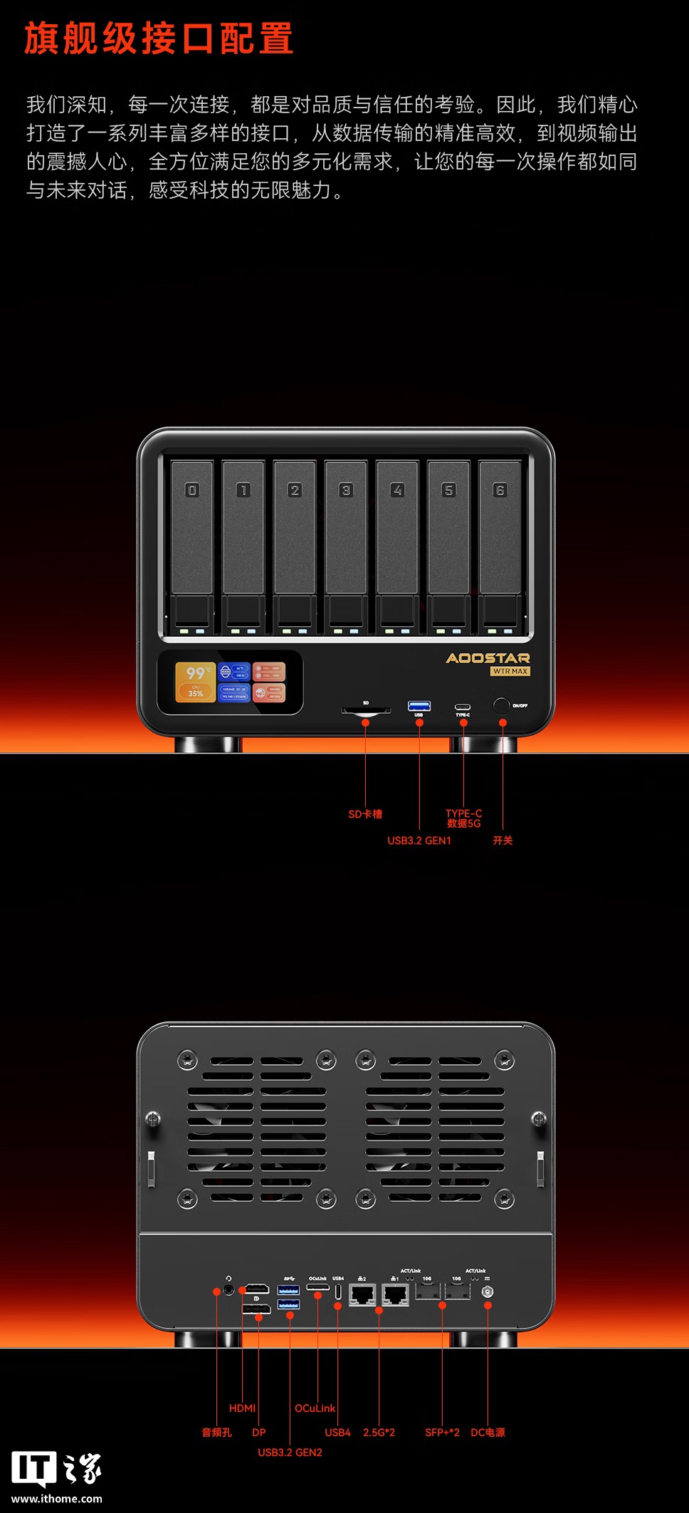 该机背面配备 1 个 3.5mm 音频接口、1 个 HDMI 接口、1 个 DP 接口、2 个 USB-A 3.2 Gen 2 接口、1 个 OCuLink 接口、1 个 USB4 接口、2 个 2.5G 网口、2 个 SFP+ 接口。