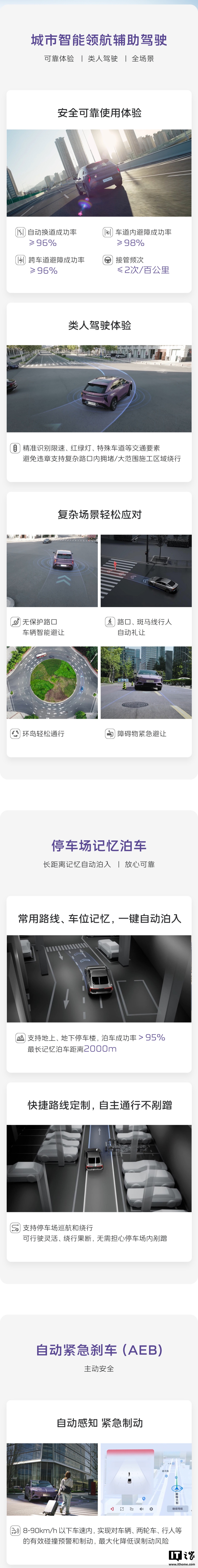 据介绍,红旗天工 08 此次 OTA 升级加入城市智能领航辅助驾驶、停车场记忆泊车、自动紧急刹车(AEB)等功能,支持识别限速 / 红绿灯 / 特殊车道等交通要素、无保护路口车辆智能避让、路口 / 斑马线行人自动礼让、环岛通行、障碍物紧急避让、记忆常用路线 / 车位(一键自动泊入)、8-90km/h 以下车速内对车辆、两轮车、行人等进行碰撞预警和制动。