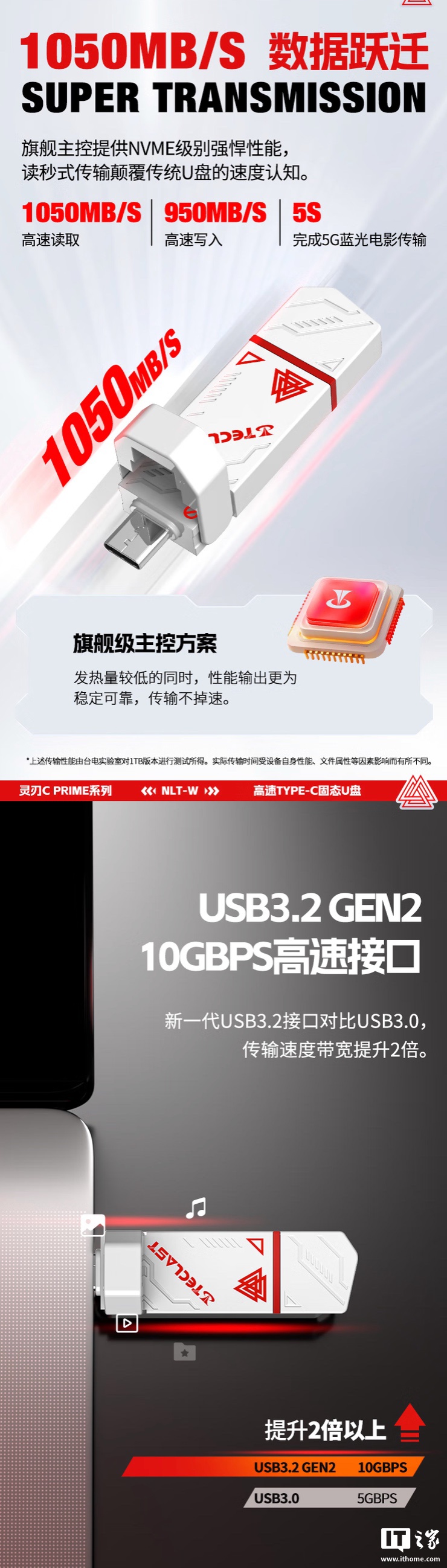 这款 U 盘采用白色外壳,点缀有红色电竞风格装饰,其采用 USB 3.2 Gen 2 规格,配 USB-C / A 双接口,读速至高 1050MB/s,写速至高 950MB/s。