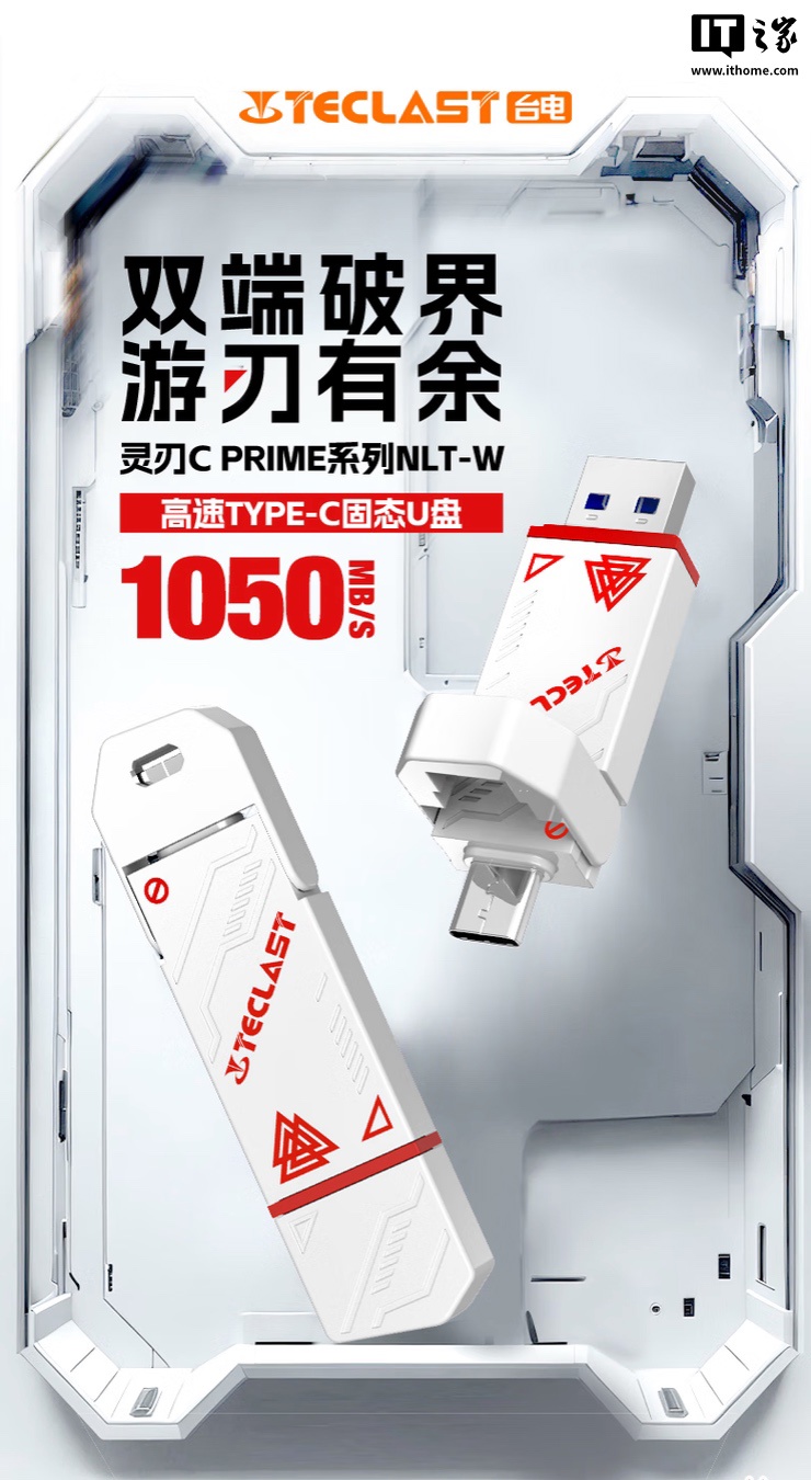 IT之家 4 月 1 日消息,台电发文宣布推出一款“灵刃 C Prime 固态 U 盘”,可选 256GB-1TB 版本,读速至高 1050MB/s,定价为 178 元起,IT之家整理价格信息如下: