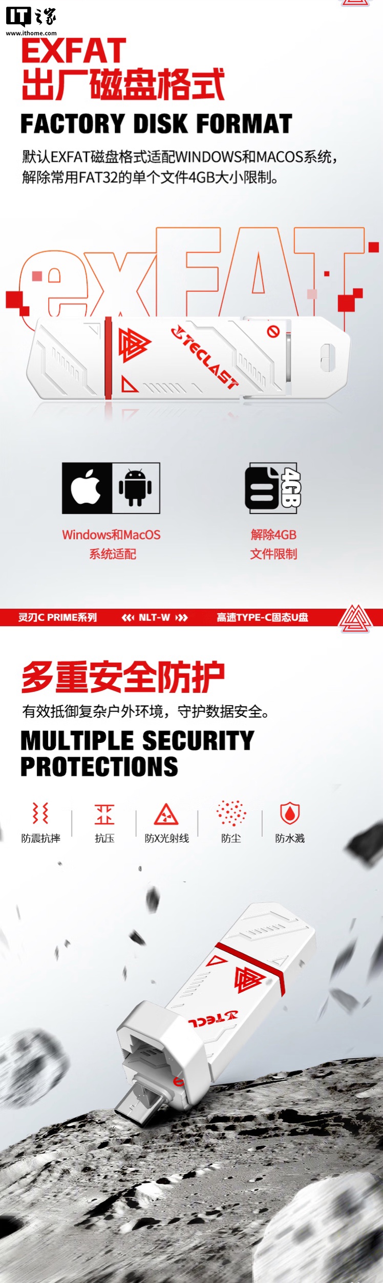 该 U 盘默认采用 exFAT 格式,支持抗震抗摔、抗压、防尘、防水溅等特性。