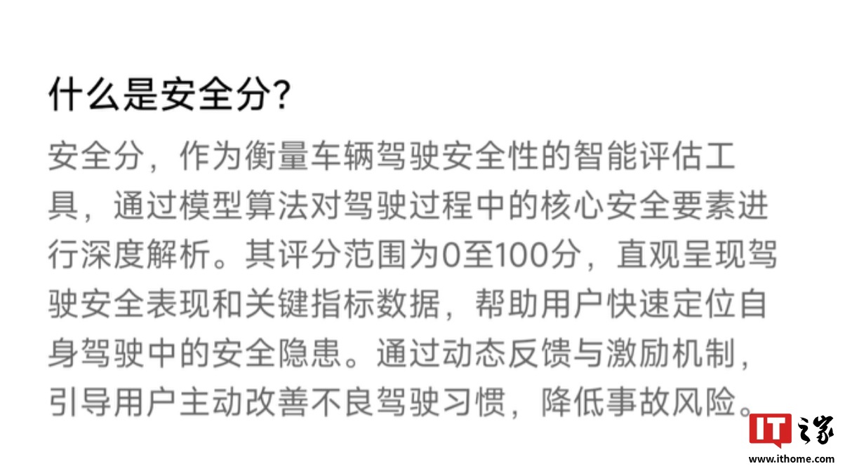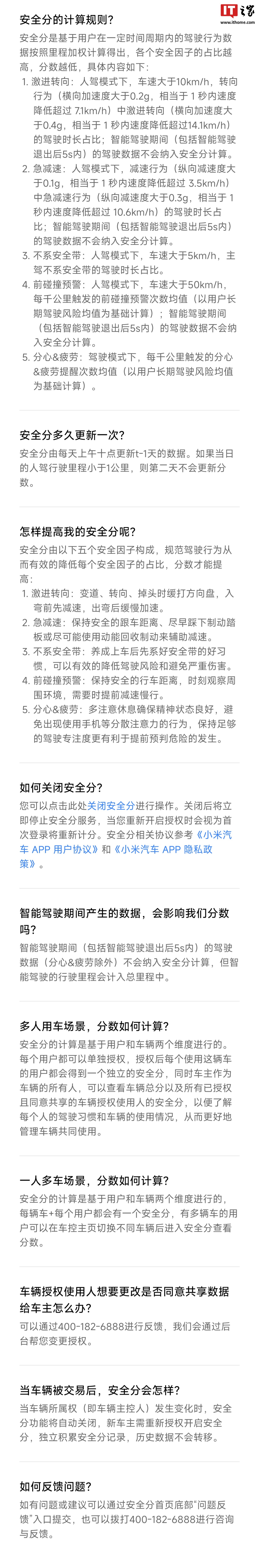 参考相应“安全分 Beta”页面中的“常见问题”,小米介绍称相应安全分系“作为衡量车辆驾驶安全性的智能评估工具”,主要通过模型算法对驾驶过程中的核心安全要素进行深度解析。其评分范围为 0 至 100 分,直观呈现驾驶安全表现和关键指标数据、帮助用户快速定位自身驾驶中的安全隐患。通过动态反馈与激励机制,引导用户主动改善不良驾驶习惯,降低事故风险。