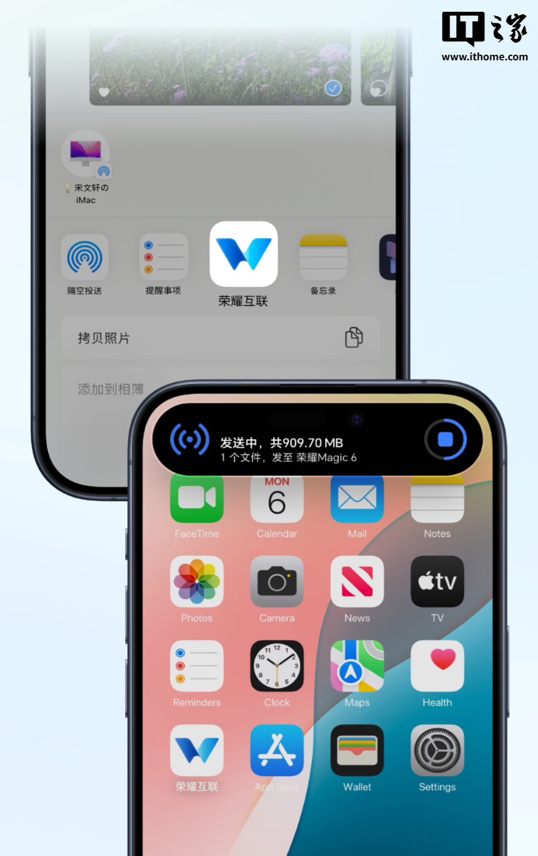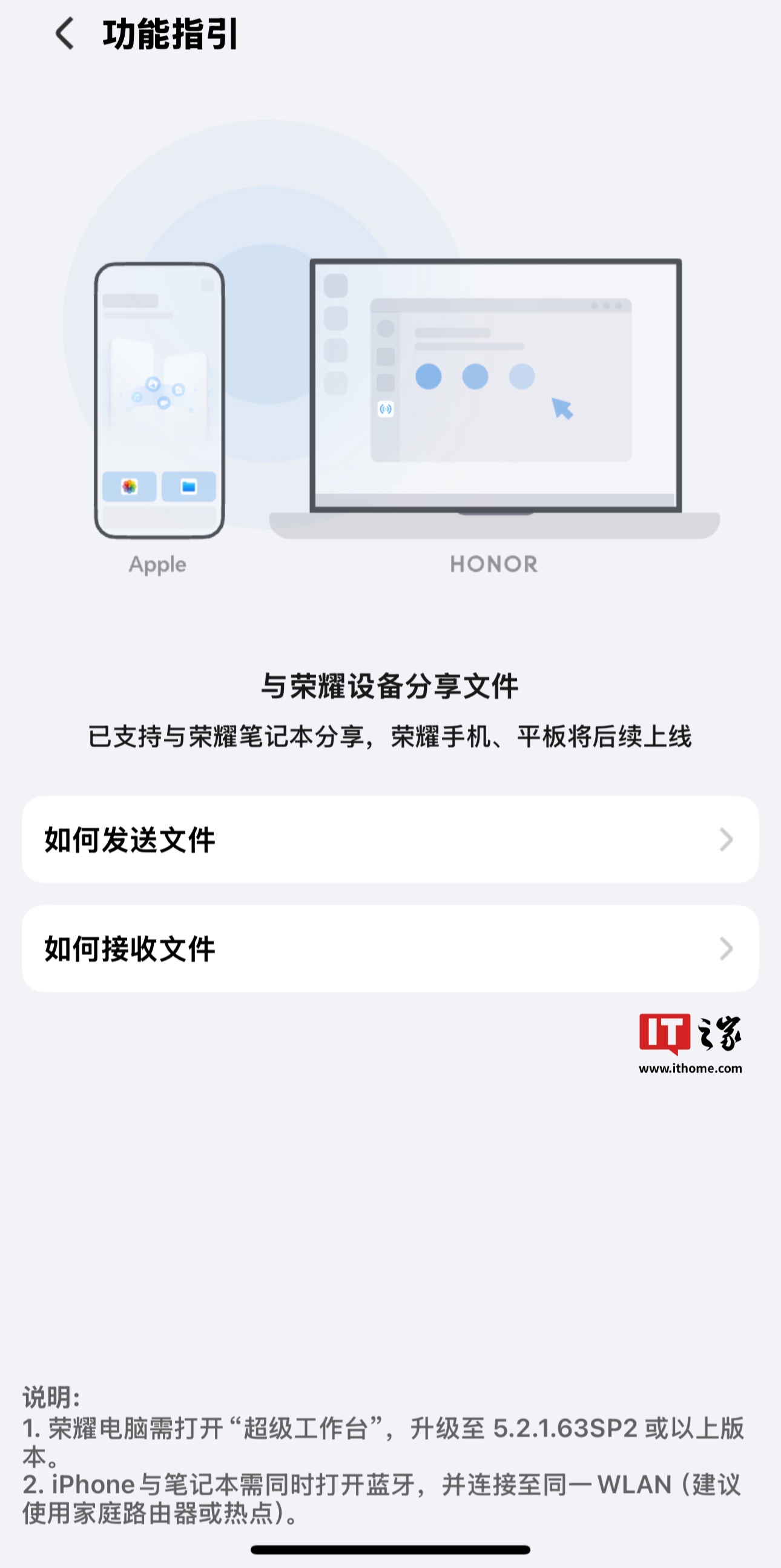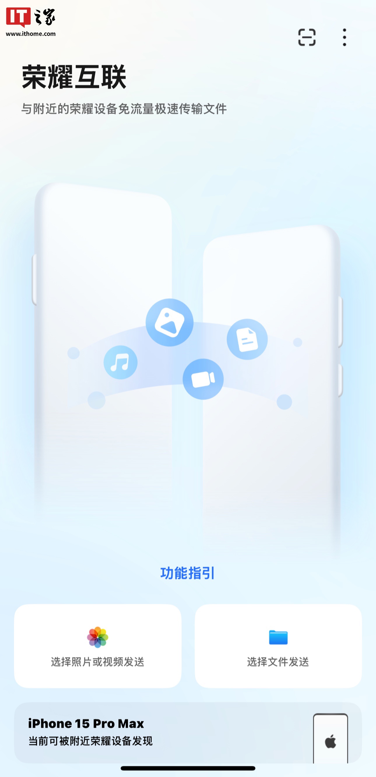 荣耀官方介绍称,这款应用可以实现荣耀和苹果设备间“免流量”互传文件,用户只需在 iPhone / iPad 设备上开启相应 App,并在荣耀设备上开启“荣耀分享”建立连接后即可随心互传文件。同时,iPhone / iPad 用户也可以通过 iOS 系统原生文件“共享”面板直接将文件发送至荣耀设备。