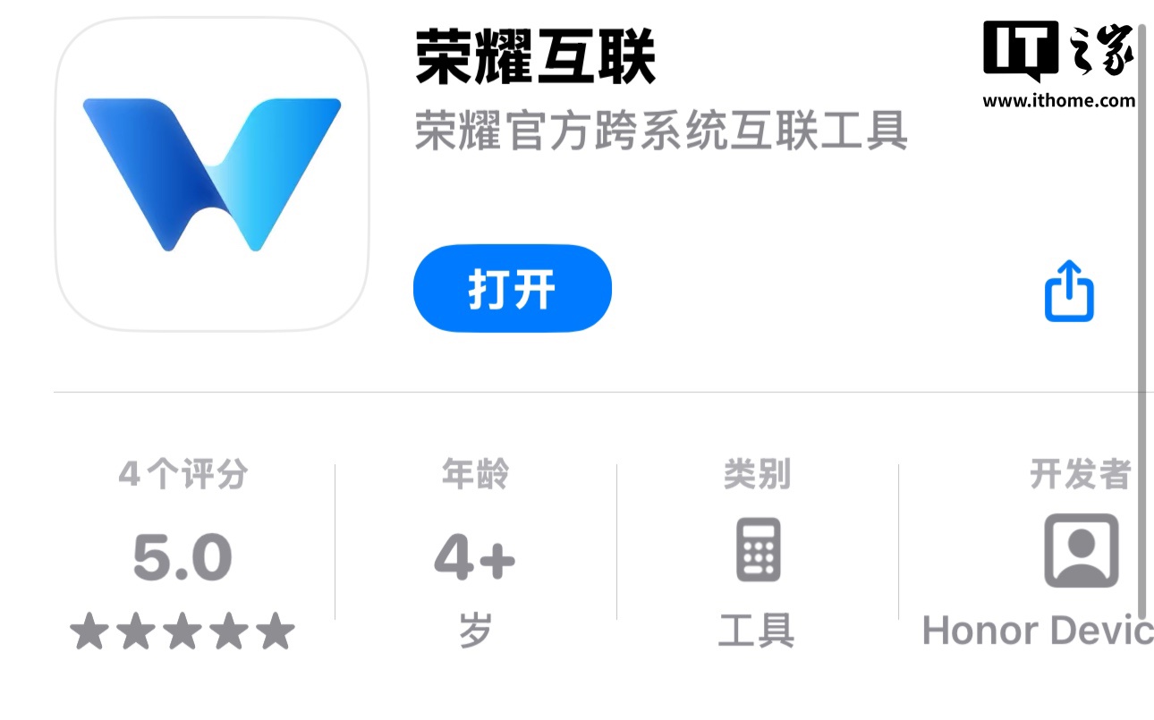 IT之家 4 月 1 日消息,荣耀旗下“荣耀互联”App 现已在苹果 iOS 平台上架,可便于 iPhone / iPad 设备与荣耀电脑、手机间传输文件。