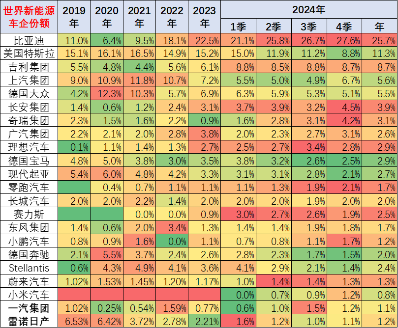 据称,2021 年中国全年保持 52% 的较强水平;2022 年的中国新能源乘用车世界份额超过 63%;2023 年的中国占世界份额 64%;2024 年达到了 70.4% 的份额,其中 10-12 月甚至达到 75%。