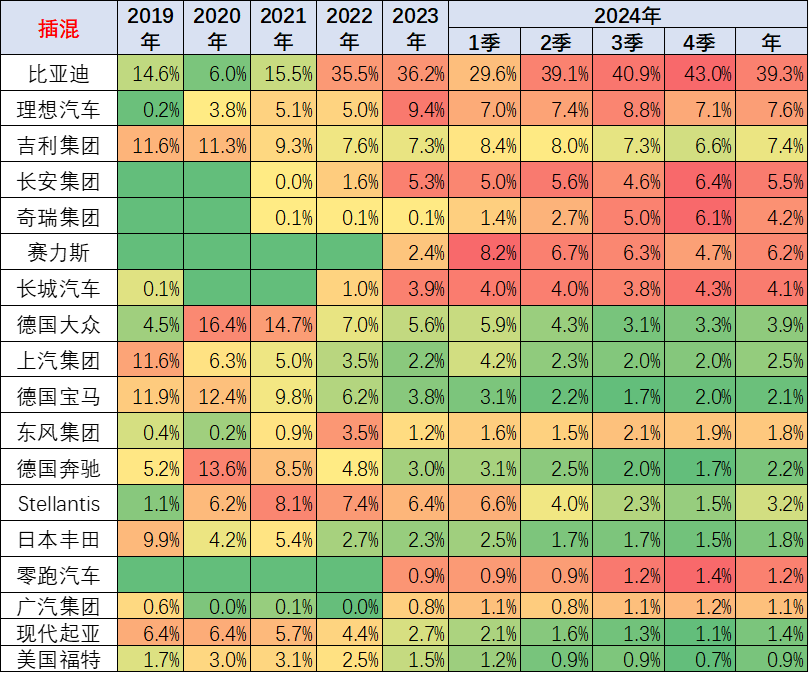 从车企的插电混动份额来看,比亚迪表现最为突出。比亚迪 2020 年的世界插电混动份额下降到 6% 的低位水平,但 2021 年上升到 16% 的水平,2023 年上升到世界插电混动份额 36% 的水平,2024 年的比亚迪插混份额 39%,10-12 月份额达到 43%,体现了比亚迪插电混动市场的领军表现。