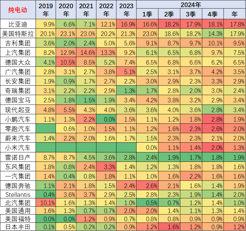 从车企的纯电动份额来看,比亚迪从 2017-2021 年总体保持在 7% 以上的份额水平,然后在 2022 年上升到 12%,2023 年的份额上升到 17%,2024 年的份额突破到 18%。