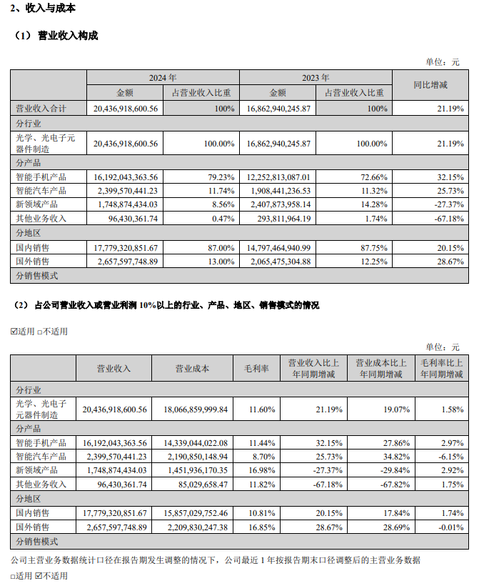 IT之家 4 月 1 日消息,欧菲光今晚发布公告,2024 年营业收入 204.37 亿元,同比增长 21.19%。