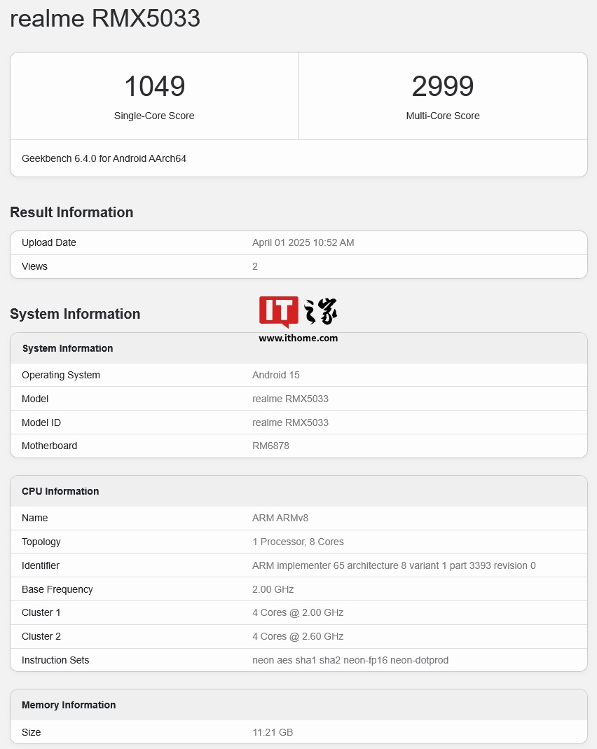 IT之家 4 月 2 日消息,科技媒体 xpertpick 昨日(4 月 1 日)发布博文,报道称 realme 真我 Narzo 80 Pro 手机(型号 RMX5033)现身 Geekbench 跑分平台,确认搭载联发科天玑 7400 芯片,单核 / 多核得分分别为 1049/2999,配备 12GB 内存与安卓 15 系统。