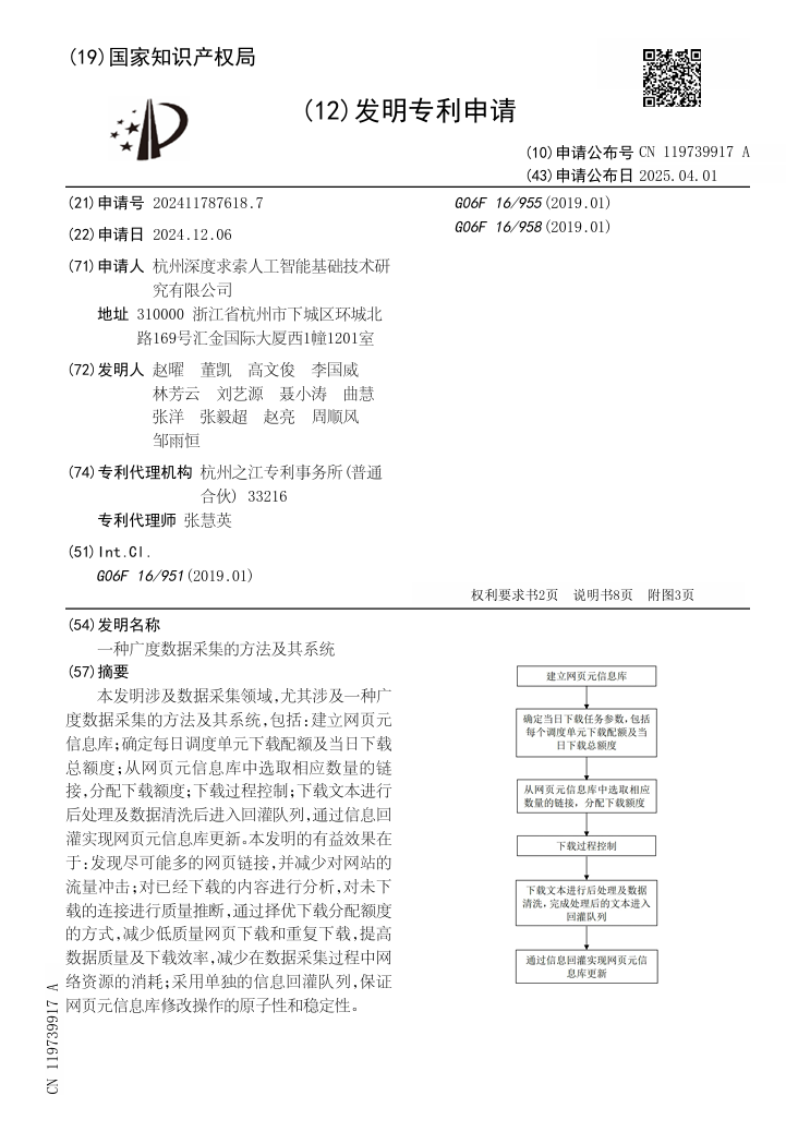 IT之家 4 月 2 日消息,IT之家从国家知识产权局中国专利公布公告网获悉,DeepSeek 关联公司杭州深度求索人工智能基础技术研究有限公司申请的“一种广度数据采集的方法及其系统”专利于 4 月 1 日公布。