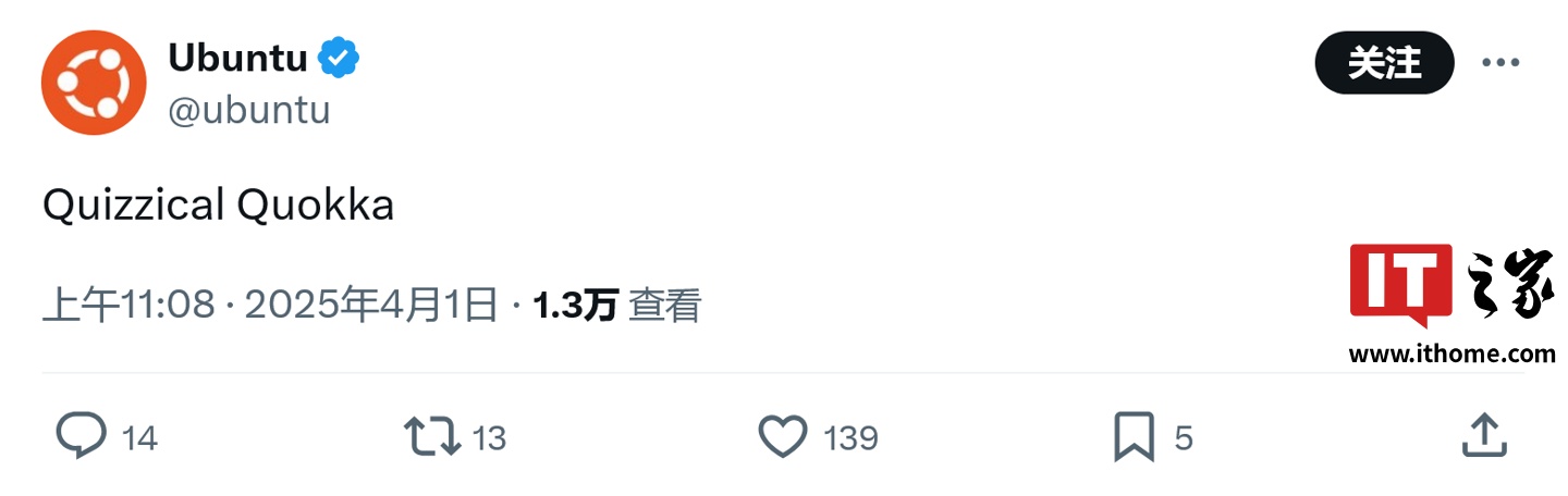 这是继 25.04 版本“Plucky Puffin”(勇敢的海鹦)后,再次采用双单词动物主题命名。IT之家注:短尾矮袋鼠(Quokka)是澳大利亚特有的小型有袋动物,官方尚未说明“quizzical"(好奇的)一词的选用理由,官方推文仅简单展示了新名称。