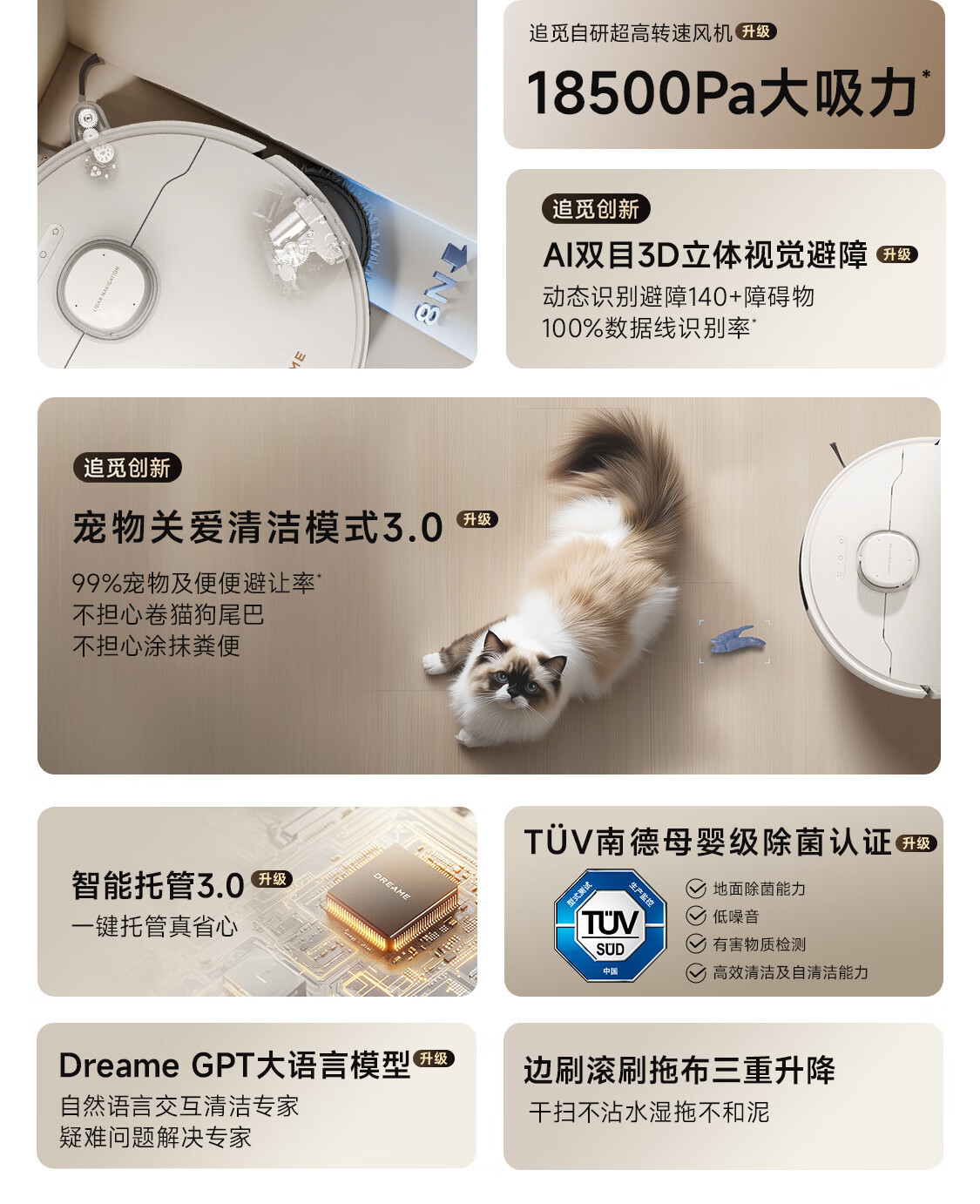 其主动式双刷 0 缠毛设计和仿人眼 AI 双目视觉系统,结合 3D 立体感知避障,能够识别避让地面 100 + 种障碍物,实现瞬吸毛发且 0 缠绕。