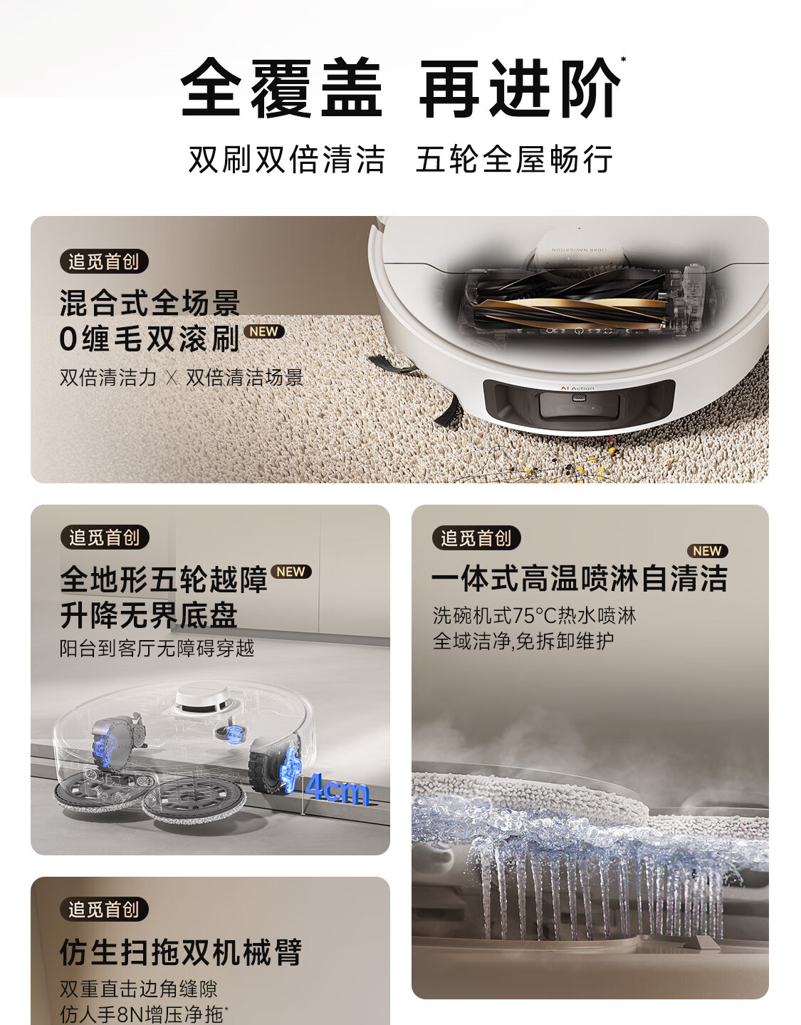 12000Pa 吸力提供了强大的清洁性能,而基站天花板设计和双刮洗臂自清洁基站保证了 99.5% 的大颗粒清洁效率。