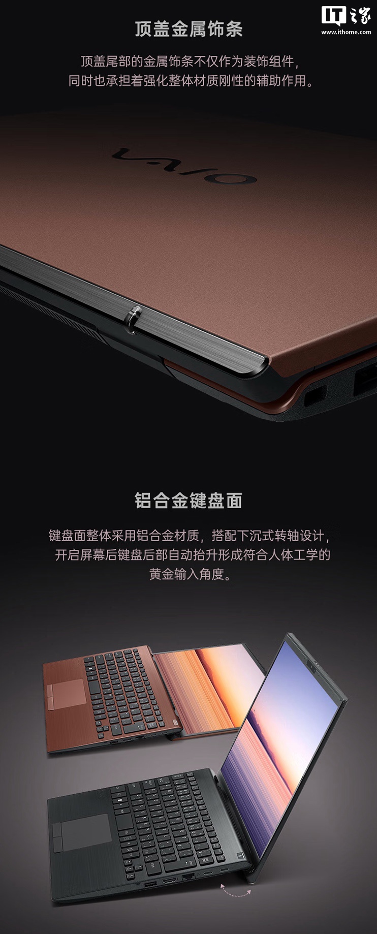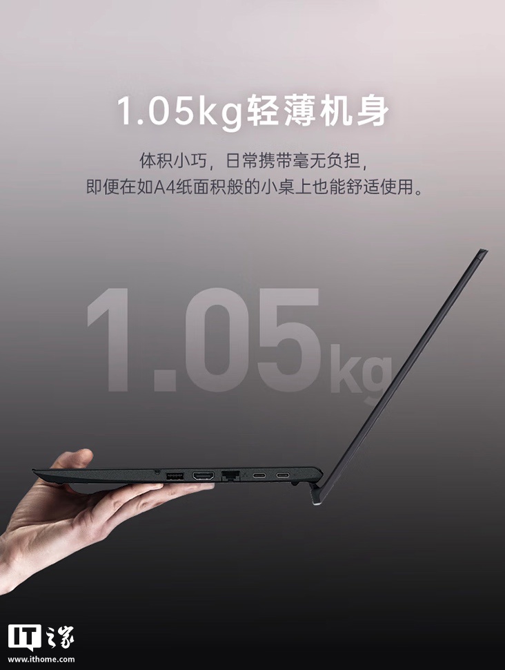 官方介绍称,这款笔记本提供“金榈棕”与“雅质黑”两款配色,整体重量 1.05 千克,笔记本 A 面尾部配备金属饰条,B 面采用铝合金材质,配有下沉式转轴设计(屏幕支持 180 度开合),使用 19mm 全键距键盘搭配 0.3mm 弧面键帽,通过美国 MIL-STD-810H 军规测试,笔记本内置 51Wh 电池,续航至高 13 小时。