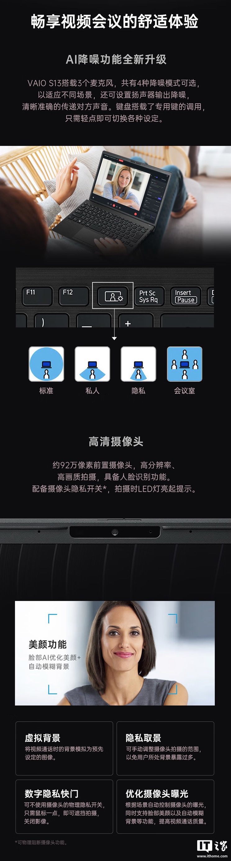 该机配备一块 1920x1200 分辨率 60Hz 13.3 英寸面板,配备 92 万像素前置摄像头(提供物理摄像头隐私开关),官方强调该机全新升级“VAIO 视频会议控制”软件,配备 AI 降噪麦克风,4 种模式可选,一键切换。
