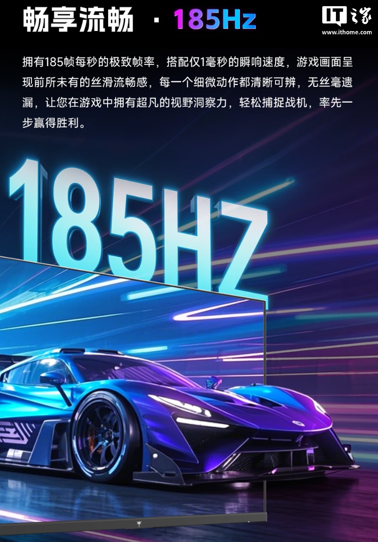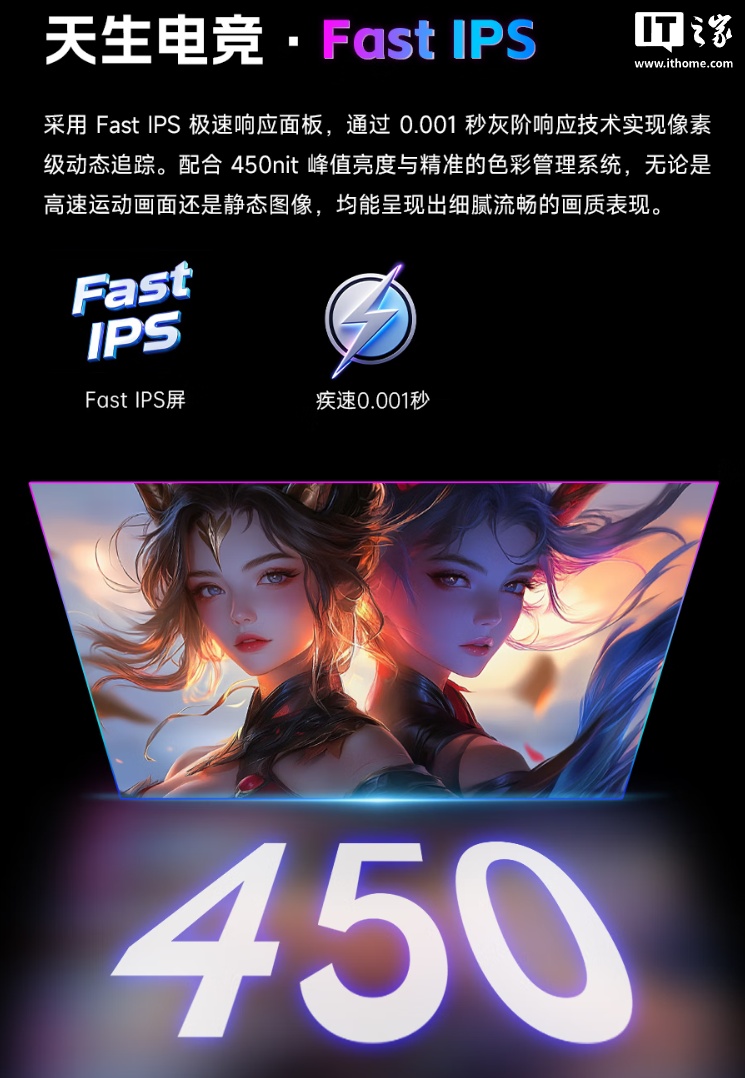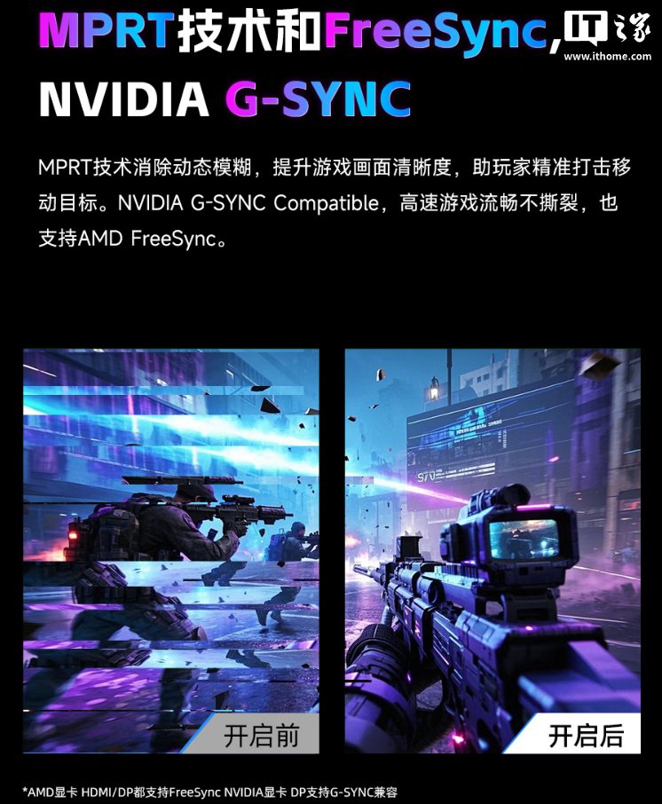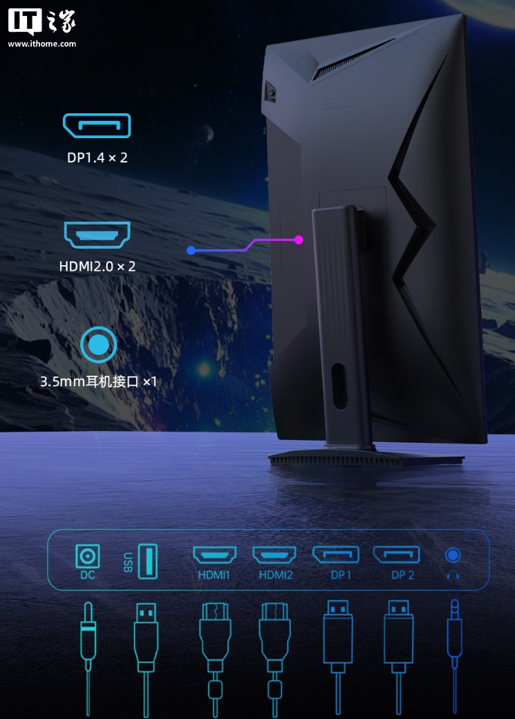 该款显示器分辨率为 2560×1440,拥有 178° 可视角度,支持硬件低蓝光、MPRT 动态模煳消除技术,并提供 2 个 DP 1.4、2 个 HDMI 2.0 和 1 个 3.5mm 耳机接口。