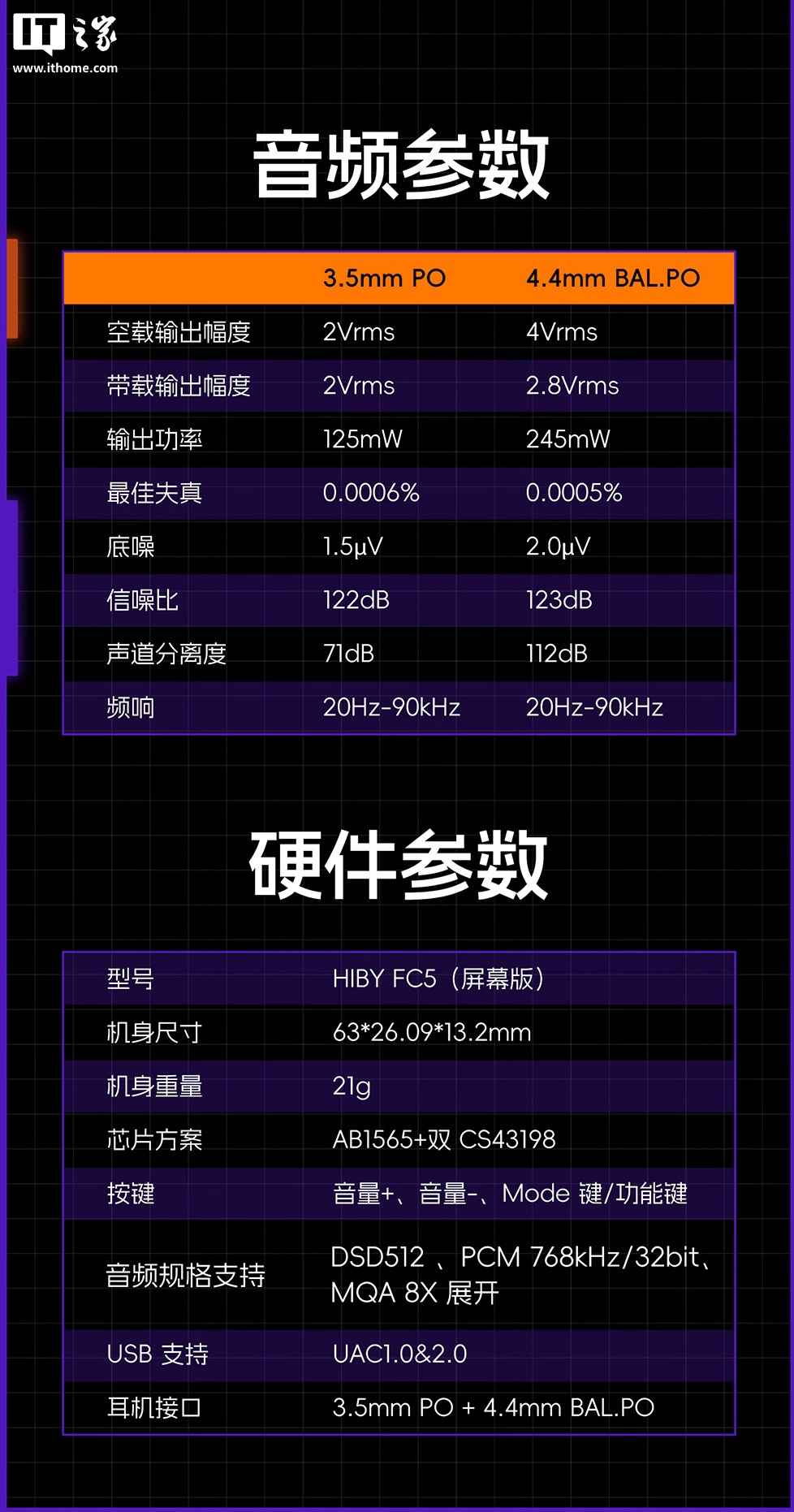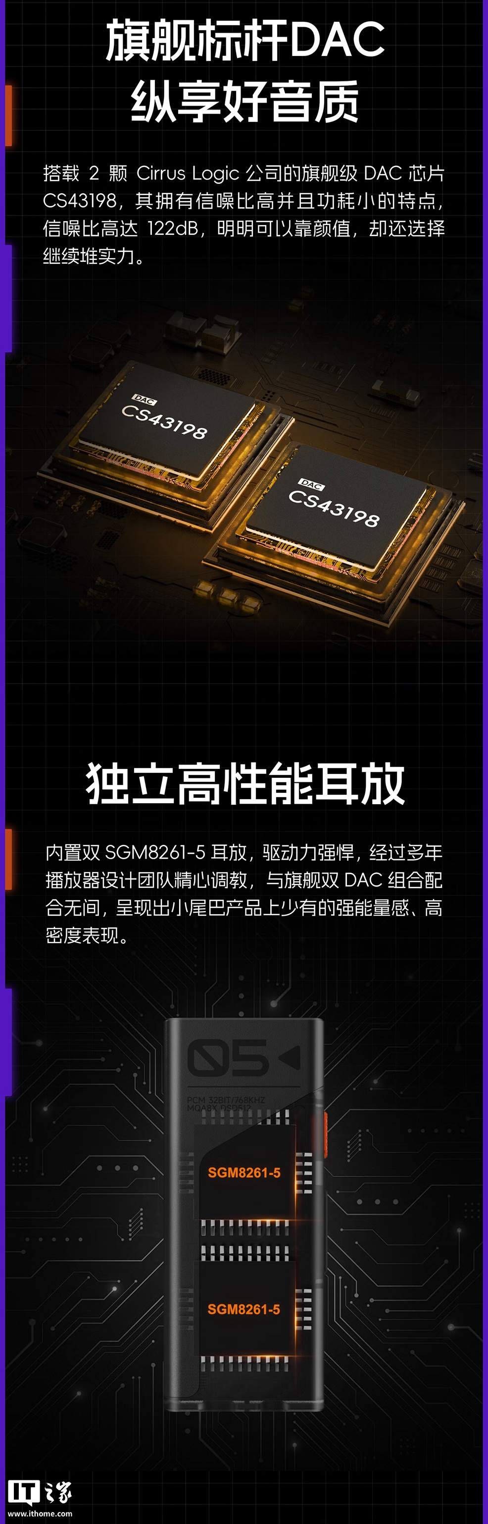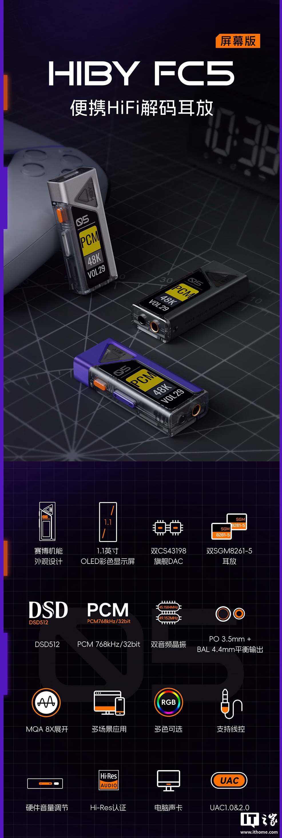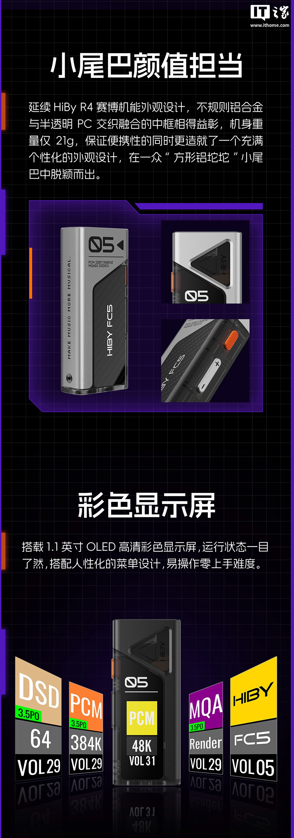官方介绍称,这款耳放采用“赛博朋克”风格设计,融合铝合金、玻璃及透明磨砂 ABS 不同材质,拥有一定质感。耳放配备 1.1 英寸 OLED 面板,支持显示当前歌曲的文件格式、采样率、音量大小等信息。