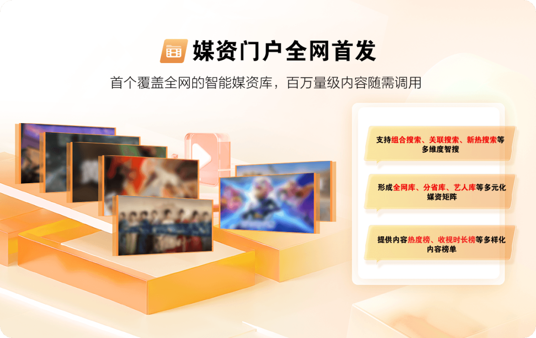 通过引入组合搜索(如:“类型 + 地区 + 年代”交叉筛选)、关联搜索(如:基于内容相似度智能推荐)、新热搜索(动态捕捉热播趋势)等智搜功能,快速定位目标资源。依托数据追踪与智能分析能力,生成内容热度榜、收视时长榜等多元化榜单,为内容运营编排提供量化决策依据。
