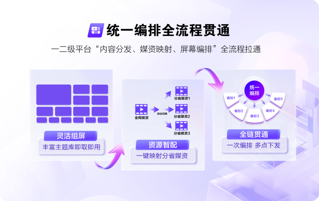 面对传统运营模式下 31 省屏幕重复编排,运营效率低下问题,中国移动智家中心协同 31 省公司及牌照方,首次实现一二级平台“内容分发、媒资映射、屏幕编排”全流程拉通。