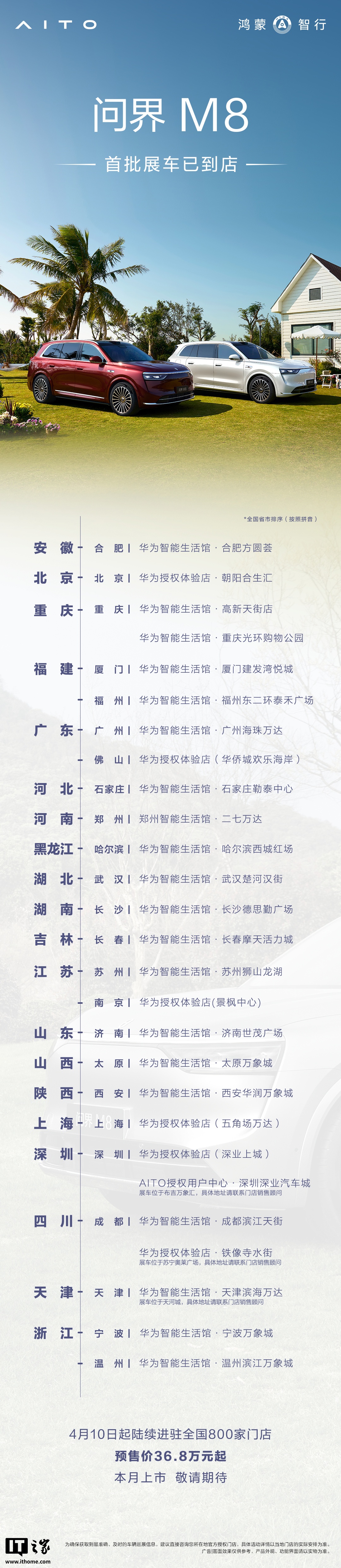据官方介绍,问界 M8 汽车将于 4 月 10 日起陆续进驻全国 800 家门店。