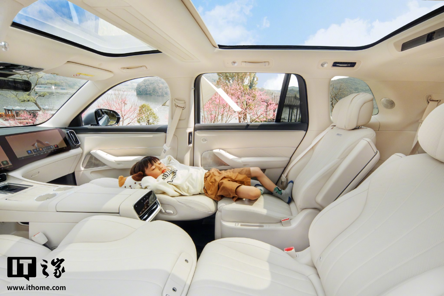 IT之家此前报道,新车将提供白沙杏、赤茶橘、琥珀棕、星云红四款内饰配色。目前内饰官图已公布:其前排座椅放倒后与第二排座椅,可以形成一个躺平空间。车辆顶部天窗被分为两个部分,配备智能激光投影系统,搭配麦克风可以 K 歌,还带有冰箱系统。