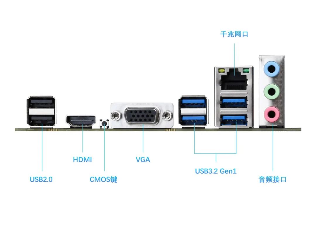后置 I/O 面板接口齐全,包括 4 个 USB 3.2 Gen1 接口,2 个 USB 2.0 接口,搭载 HDMI+VGA 双显示接口以及音频接口,还提供了独立 M.2 Wi-Fi 蓝牙无线网卡接口(PCIE 协议)。IT之家附参数详情: