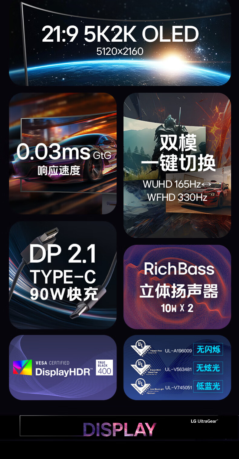 49GX950A-B 采用了一块 44.5 英寸的 5120×2160 分辨率(21:9 长宽比)800R 曲率 WOLED 显示面板,像素密度达到了 125PPI。其在标准模式下刷新率为 165Hz,也支持切换到 2560×1080 330Hz 的第二模式。