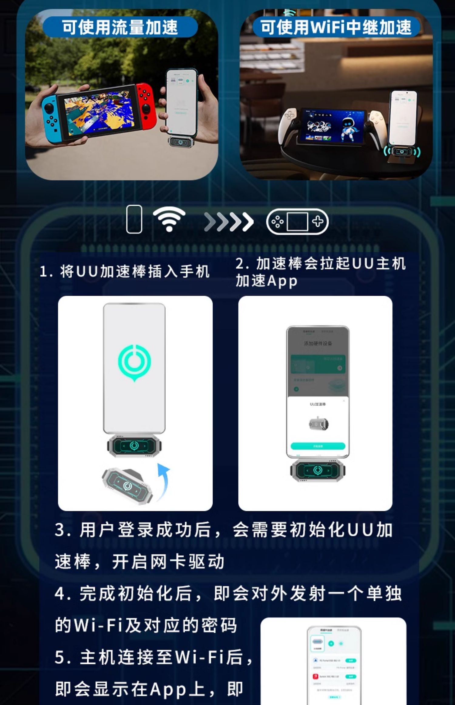 据介绍,网易 UU 加速棒适配大部分 Type-C 接口设备及主机(适配主机:Switch、PS、Xbox、ROG 掌机、Legion Go、Steam Deck、PICO、Meta Quest 全系列)使用,支持专属 Wi-Fi 发射,能适配更复杂的网络环境,支持餐厅、机场公共 Wi-Fi 或校园网、咖啡店认证 Wi-Fi。